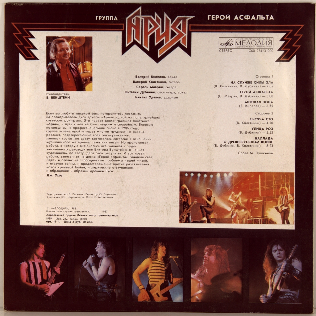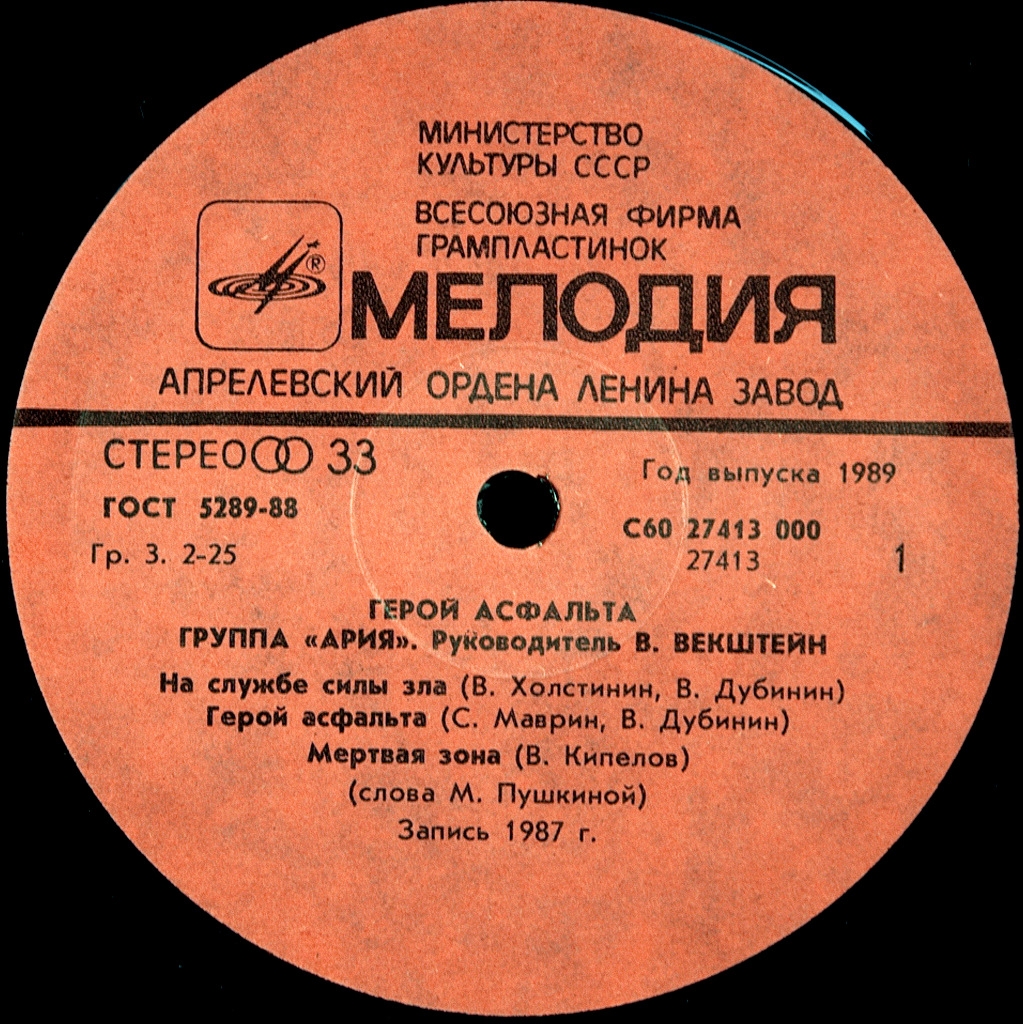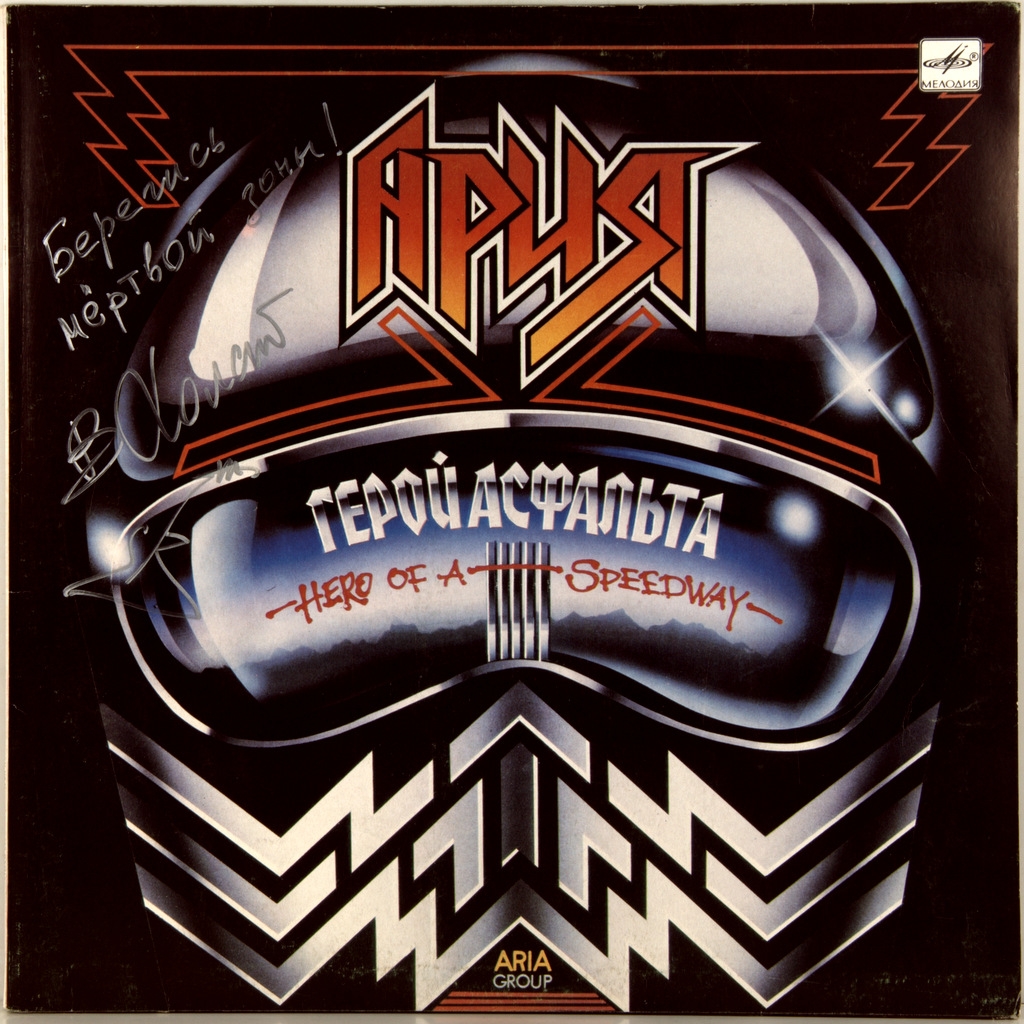 АРИЯ-ГЕРОЙ АСФАЛЬТА (+В. ХОЛСТИНИН АВТОГРАФ)-1988-ПЕРВЫЙ ПРЕСС USSR-MELODIA-С6027413000. Редкий оригинал культового альбома. «Герой асфальта» — третий студийный альбом группы «Ария». Это первый альбом после раскола группы в начале 1987 года «Герой Асфальта» также первый альбом, официально выпущенный «Мелодия», два предыдущих альбома на тот момент существовали и распространялись как магнитоальбомы только на магнитофонных кассетах. Альбом имел большой успех, его продажи превысили 1 миллион экземпляров (что в США соответствует платиновому статусу), но точный тираж неизвестен даже фирме «Мелодия», хотя, с её слов, было напечатано как минимум 1,5 миллиона пластинок.На этом альбоме впервые все тексты написаны Маргаритой Пушкиной, а Александр Елин, писавший лирику к предыдущим альбомам, ушёл в группу «Мастер» и не работал с Арией вплоть до 2001 года.В 2008 году проведен концертный тур в честь 20-летия альбома, по результатам которого выпущен двойной концертный альбом и концертное видео «Герой асфальта XX лет». На концерте выступил состав оригинального альбома и все произведения были исполнены в том же порядке. В мае 2012 года в результате голосования, проходившего на сайте openspace.ru, альбом «Герой Асфальта» встал на первую позицию в списке 50 главных пластинок «Мелодии» и 23 апреля 2013 был заново переиздан на виниле ограниченным тиражом 500 экземпляров в рамках проекта «Мелодия-50», посвященного 50-летию фирмы.