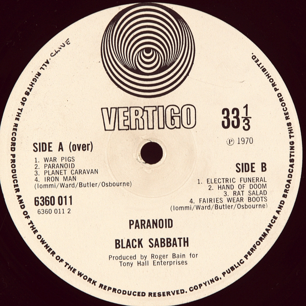 BLACK SABBATH-PARANOID-1970-ОРИГИНАЛЬНЫЙ ПРЕСС 1971 UK-VERTIGO-6360011. Матрицы A-2/B-2. Очень редкое второе прессование на малом SWIRL. Paranoid — второй студийный альбом британской рок-группы Black Sabbath, записанный в лондонской Regent Sound Studios продюсером Роджером Бэйномruen и вышедший в 1970 году. 10 октября 1970 года альбом поднялся на вершину UK Albums Chart, вытеснив с первого места Bridge Over Troubled Water Саймона и Гарфанкла; в США он достиг 12-го места.