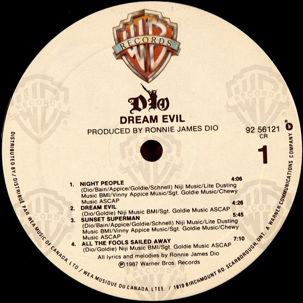 DIO-DREAM EVIL-1987-ПЕРВЫЙ ПРЕСС USA-WARNER BROS- 1-25612 Очень редкий канадский оригинал оригинал известного фронтмена. Dream Evil — четвёртый студийный альбом группы Dio, вышедший 21 июля 1987 года. В записи Dream Evil участвовали новые члены группы Крэйг Голди и Клод Шнелл. Альбом сопровождали синглы «All The Fools Sailed Away» и «I Could Have Been a Dreamer». Альбом достиг 8 места в чартах Британии.