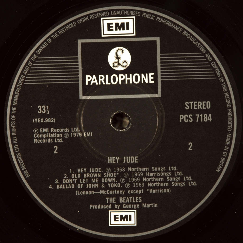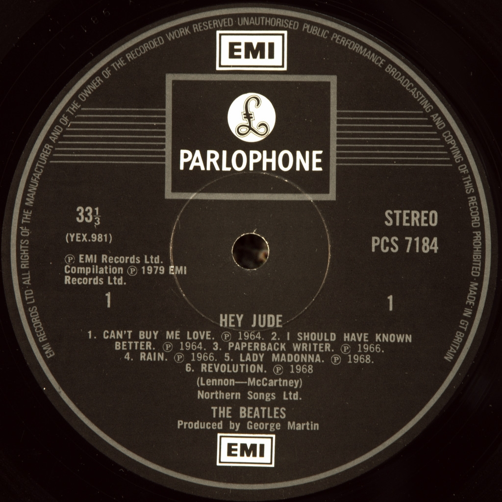 BEATLES-HEY JUDE-1970-ПЕРВЫЙ ПРЕСС- UK-APPLE-номер PCS 7184. Matrix numbers: Side 1: YEX 981-1; Side 2: YEX 982-1. Стампера 1G/1L (Мечта!) Ранее выпускался только на экспорт в США и Британское Содружество Наций, этот альбом в конечном итоге был официально выпущен в Великобритании почти через девять лет после появления в США. Альбом включает в себя большинство поздних синглов The Beatles, выпущенных в 1968 и 1969 годах Первый пресс 21 мая 1979 г. Черная этикетка с двумя бело-черными логотипами EMI и серебряной печатью. “The EMI Records Ltd...” напечатано в самом начале периметральной печатью и “Сделано в GT. Британия”, напечатанная в конце печати по периметру.