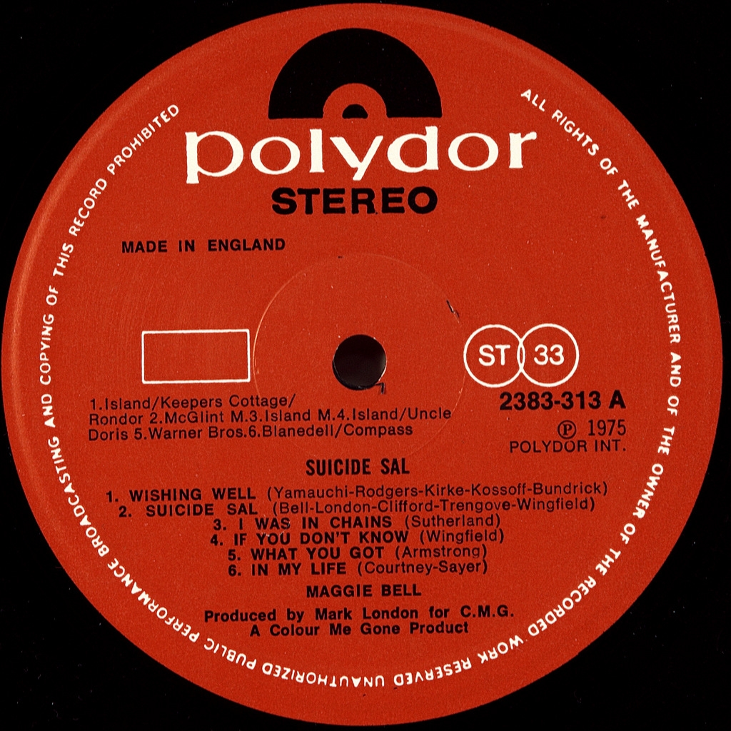 MAGGIE, BELL(EX-STONE THE CROWS)-SUICIDE SAL-1975-ПЕРВЫЙ ПРЕСС UK-POLYDOR-2383313. Очень редкий оригинал блюзовой вокалистки из STONE THE CROWS. Stone the Crows распались в 1973 году, после случайной смерти Лесли Харви от удара током 2 мая 1972 года. Харви был неотъемлемой частью группы и ее музыки. Питер Грант стал менеджером Белл после раскола, и вместе с Марком Лондоном предложил Белл помочь записать сольный альбом. Грант руководил выпуском ее первого сольного альбома Queen of the Night (1974), который был записан в Нью-Йорке. с продюсером Джерри Векслером. Лебединая песня для Белл наступила когда она подписала контракт с новообразованной тогда компанией Swan Song Records в 1974 году, Наряду с Bad Company и Pretty Things, Джимми Пейдж внес свой вклад в ее второй альбом Suicide Sal (1975).
