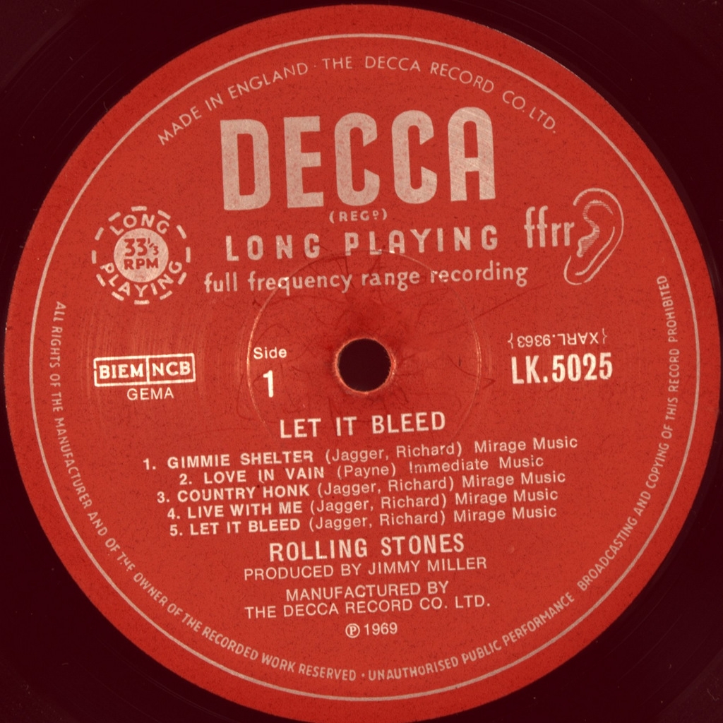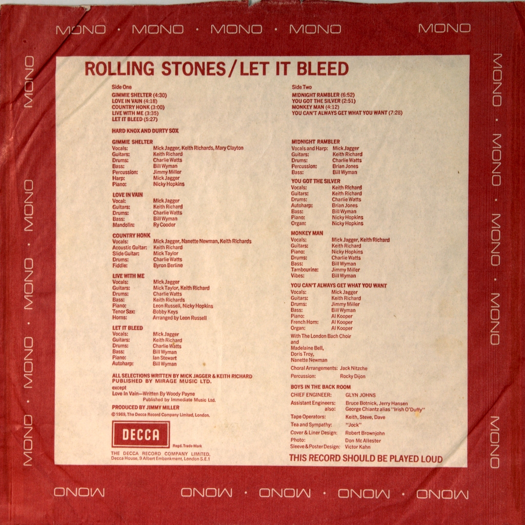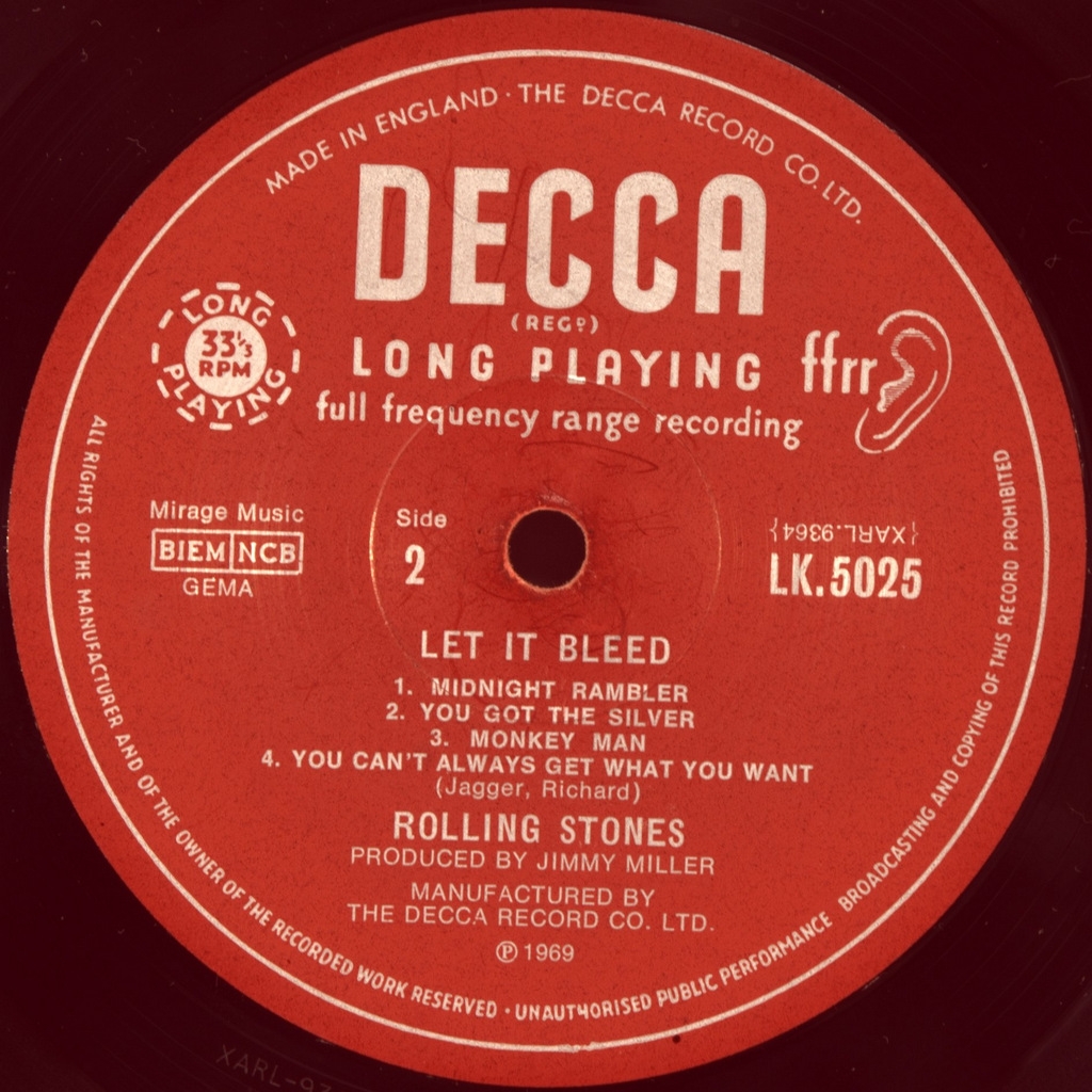 ROLLING STONES-LET IT BLEED-1969-ПЕРВЫЙ ПРЕСС(MONO) UK-DECCA- LK5025 матрицы 1A/1A стампера 1BU/1BG Мега редкий моно оригинал на открытой DECCA лейбл. Let It Bleed — восьмой британский и десятый американский студийный альбом рок-группы Rolling Stones, изданный в декабре 1969 года фирмами Decca Records (Великобритания) и London Records (США). Стал последним альбомом коллектива, в записи которого принял участие Брайан Джонс, записавший партию цитры в песнях «You Got the Silver» и перкуссию в «Midnight Rambler». Let It Bleed был включён в список «500 величайших альбомов всех времён» по версии журнала Rolling Stone под номером 32. Журнал Q поместил его на 28 позицию в списке «100 величайших альбомов, записанных в Британии».