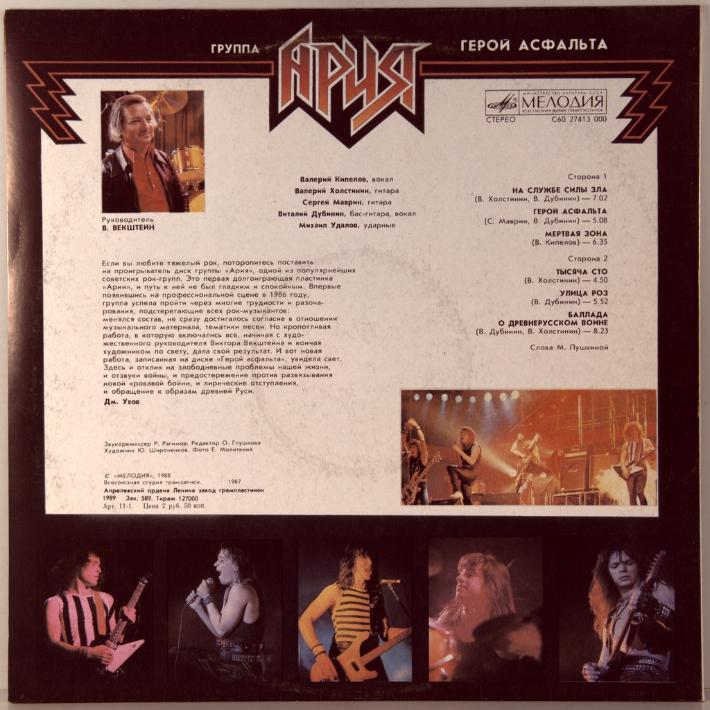 АРИЯ-ГЕРОЙ АСФАЛЬТА -1988-ПЕРВЫЙ ПРЕСС USSR-MELODIA-С6027413000. Редкий оригинал культового альбома. «Герой асфальта» — третий студийный альбом группы «Ария». Это первый альбом после раскола группы в начале 1987 года «Герой Асфальта» также первый альбом, официально выпущенный «Мелодия», два предыдущих альбома на тот момент существовали и распространялись как магнитоальбомы только на магнитофонных кассетах. Альбом имел большой успех, его продажи превысили 1 миллион экземпляров (что в США соответствует платиновому статусу), но точный тираж неизвестен даже фирме «Мелодия», хотя, с её слов, было напечатано как минимум 1,5 миллиона пластинок.На этом альбоме впервые все тексты написаны Маргаритой Пушкиной, а Александр Елин, писавший лирику к предыдущим альбомам, ушёл в группу «Мастер» и не работал с Арией вплоть до 2001 года.В 2008 году проведен концертный тур в честь 20-летия альбома, по результатам которого выпущен двойной концертный альбом и концертное видео «Герой асфальта XX лет». На концерте выступил состав оригинального альбома и все произведения были исполнены в том же порядке. В мае 2012 года в результате голосования, проходившего на сайте openspace.ru, альбом «Герой Асфальта» встал на первую позицию в списке 50 главных пластинок «Мелодии» и 23 апреля 2013 был заново переиздан на виниле ограниченным тиражом 500 экземпляров в рамках проекта «Мелодия-50», посвященного 50-летию фирмы.