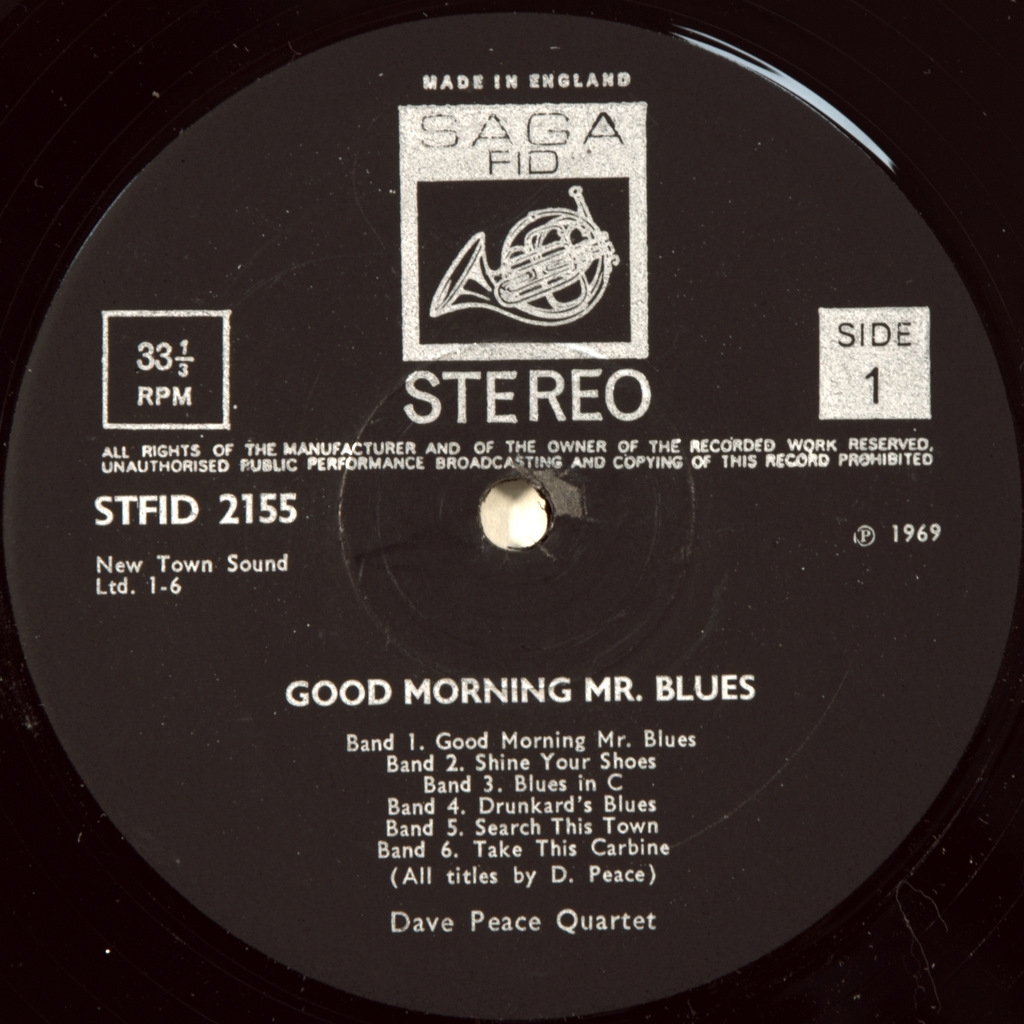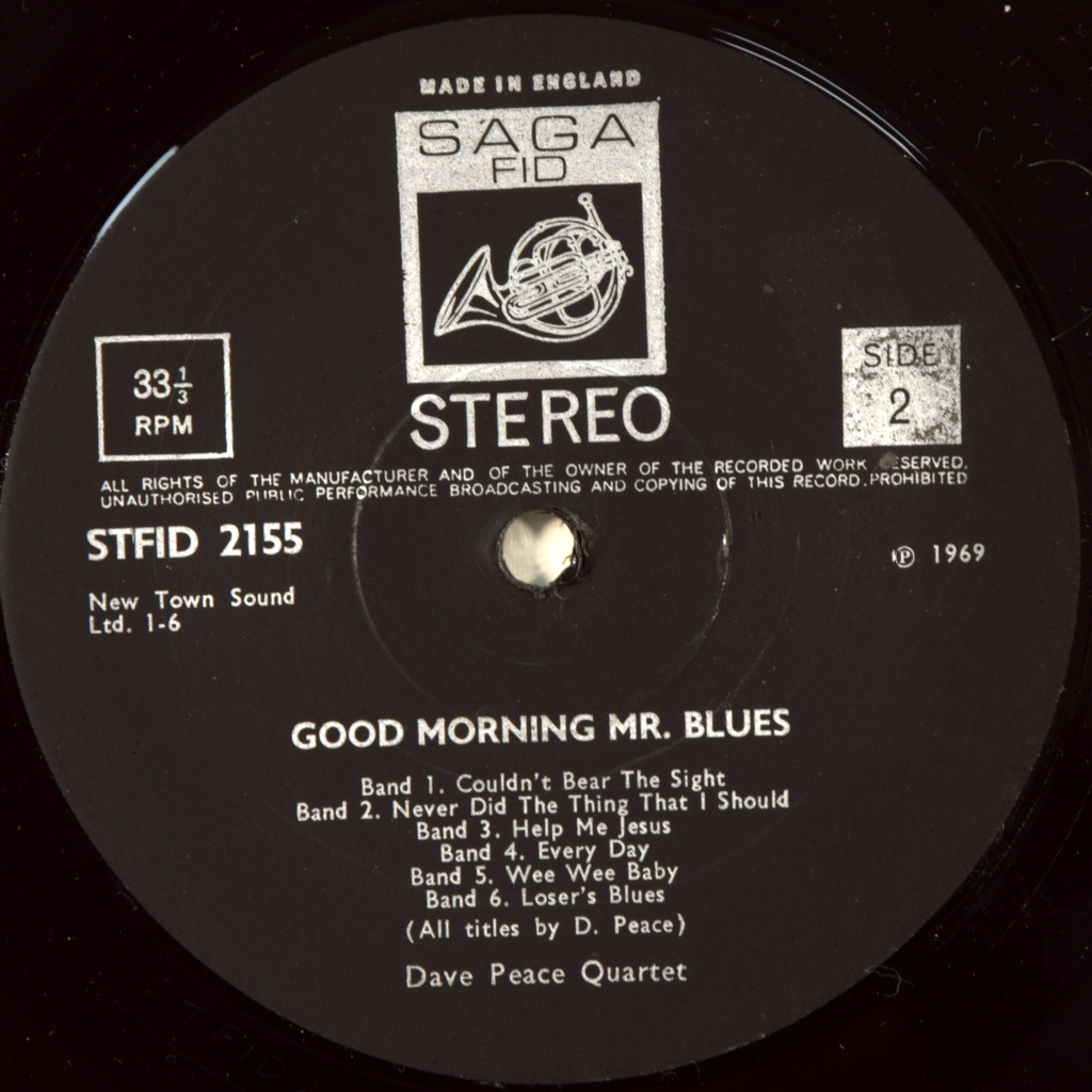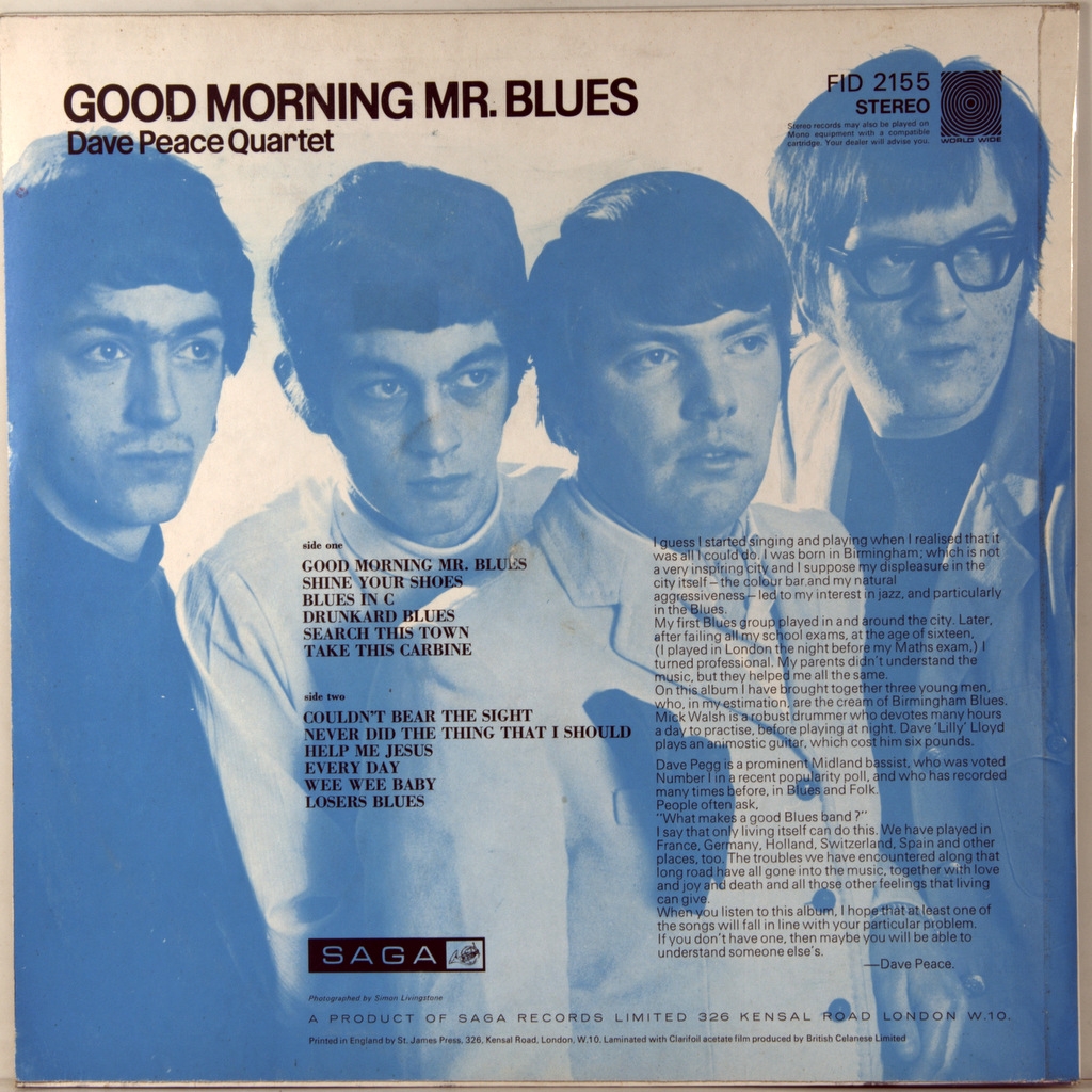DAVE PEACE QUARTET-GOOD MORNING MR. BLUES-1969-ПЕРВЫЙ ПРЕСС UK-SAGA-STFID2155. Редкий британский оригинал блюз рокеров из Британии Альбом примечателен тем что в группу вошел Dave Pegg- английский мультиинструменталист и музыкальный продюсер, в первую очередь бас-гитарист. Он является самым долгоживущим членом Совета директоров. Британский фолк-рок группа Fairport Convention и был басистом в ряде фолк - и рок - групп, включая Фолк-группа Ian Campbell Folk Group и Jethro Tull.