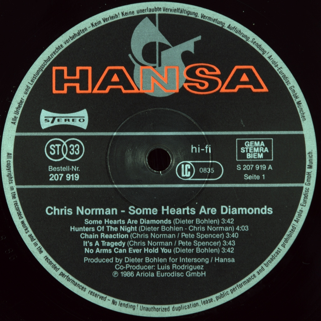 NORMAN, CHRIS (EX-SMOKIE)- SOME HEARTS ARE DIAMONDS-1986-ПЕРВЫЙ ПРЕСС GERMANY -HANSA-207919-630. Очень редкий оригинал сольного альбома . Some Hearts Are Diamonds-второй сольный альбом Криса Нормана, выпущенный в 1986 году компанией Hansa Records. Дитер Болен, ранее принадлежавший к Modern Talking, продюсировал альбом и написал несколько песен. Ведущий сингл, "Midnight Lady", был хитом номер один на большей части Европы.