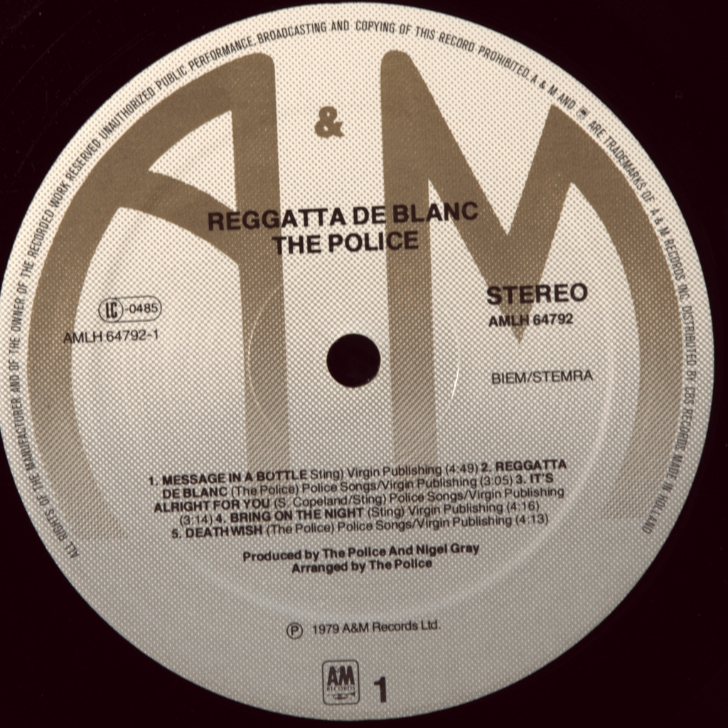 POLICE-REGGATTA DE BLANC-1979-ПЕРВЫЙ ПРЕСС HOLLAND-A/M-AMLH64792. Второй альбом британской рок-группы The Police, вышедший 5 октября 1979 года. Композиция «Reggatta de Blanc» получила премию Грэмми на 23-ей церемонии в 1981 году в категории «Лучшее инструментальное рок исполнение». Альбом Reggatta de Blanc находится на 372-м месте в списке 500 лучших альбомов всех времён по версии журнала Rolling Stone.