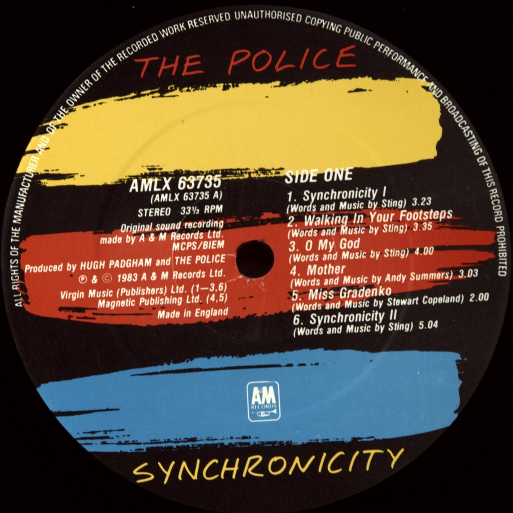 POLICE-SYNCHRONICITY-1983-ПЕРВЫЙ ПРЕСС UK-A/M--AMLX63735. Редкий оригинал культового альбома британской рок-группы. Synchronicity — пятый и последний студийный альбом британской группы The Police, самый успешный в их карьере релиз. В альбом, вышедший 1 июня 1983 года на студии A./M Records, вошли такие известные песни, как «Every Breath You Take», «Wrapped Around Your Finger», «King of Pain» и «Synchronicity II». Альбом вошёл в список 500 величайших альбомов всех времён по версии журнала Rolling Stone