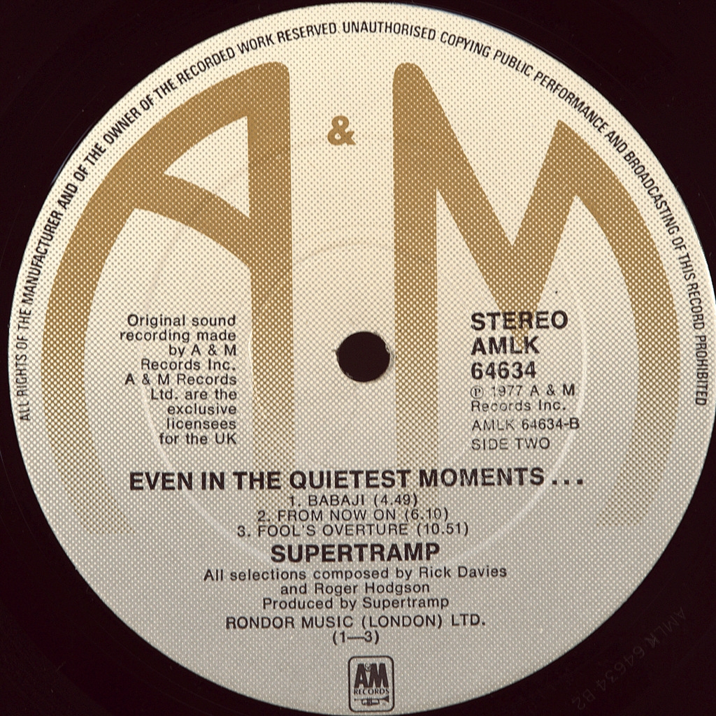 SSUPERTRAMP-EVEN IN THE QUIETEST MOMENTS,,,-1977-ПЕРВЫЙ ПРЕСС UK-A/M-AMLK64634 Матрицы A/B-2. Редкий британский оригинал. Пятый альбом английской рок-группы Supertramp, выпущенный в апреле 1977года . Он был записан в основном на студии Caribou Ranch в Колорадо с наложениями, вокалом и микшированием, завершенными на заводе звукозаписи в Лос-Анджелесе. Это был первый альбом Supertramp с участием инженера Питера Хендерсона, который будет работать с группой и на следующих трех альбомах. Альбом… достиг 16-го места в чарте Billboard Pop Albums в 1977 году и через несколько месяцев стал первым золотым (500 000 копий и более) проданным альбомом Supertramp в США. Кроме того, "немного" стал американский Топ-20 сингла и достиг # 29 в чарте Великобритании.. В 1978 Году альбом… занимал 63-е место в Мировых списках критиков, которые признали 200 величайших альбомов всех времен, за которые проголосовали известные рок-критики и диджеи.