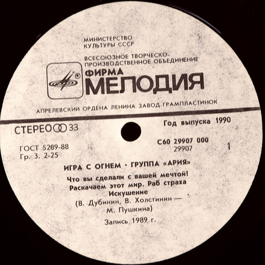 АРИЯ-ИГРА С ОГНЕМ-1990-ПЕРВЫЙ ПРЕСС USSR-MELODIA-С6029907000. Редкий оригинал культового альбома. «Игра́ с огнём» — четвёртый студийный альбом группы «Ария». Первый альбом группы с участием ударника Александра Манякина и без постоянного продюсера Виктора Векштейна. Альбом был успешным и разошёлся тиражом 835 тыс. экземпляров, хотя это намного меньше, чем предыдущий альбом «Герой асфальта», проданный в количестве минимум 1,5 млн. копий.