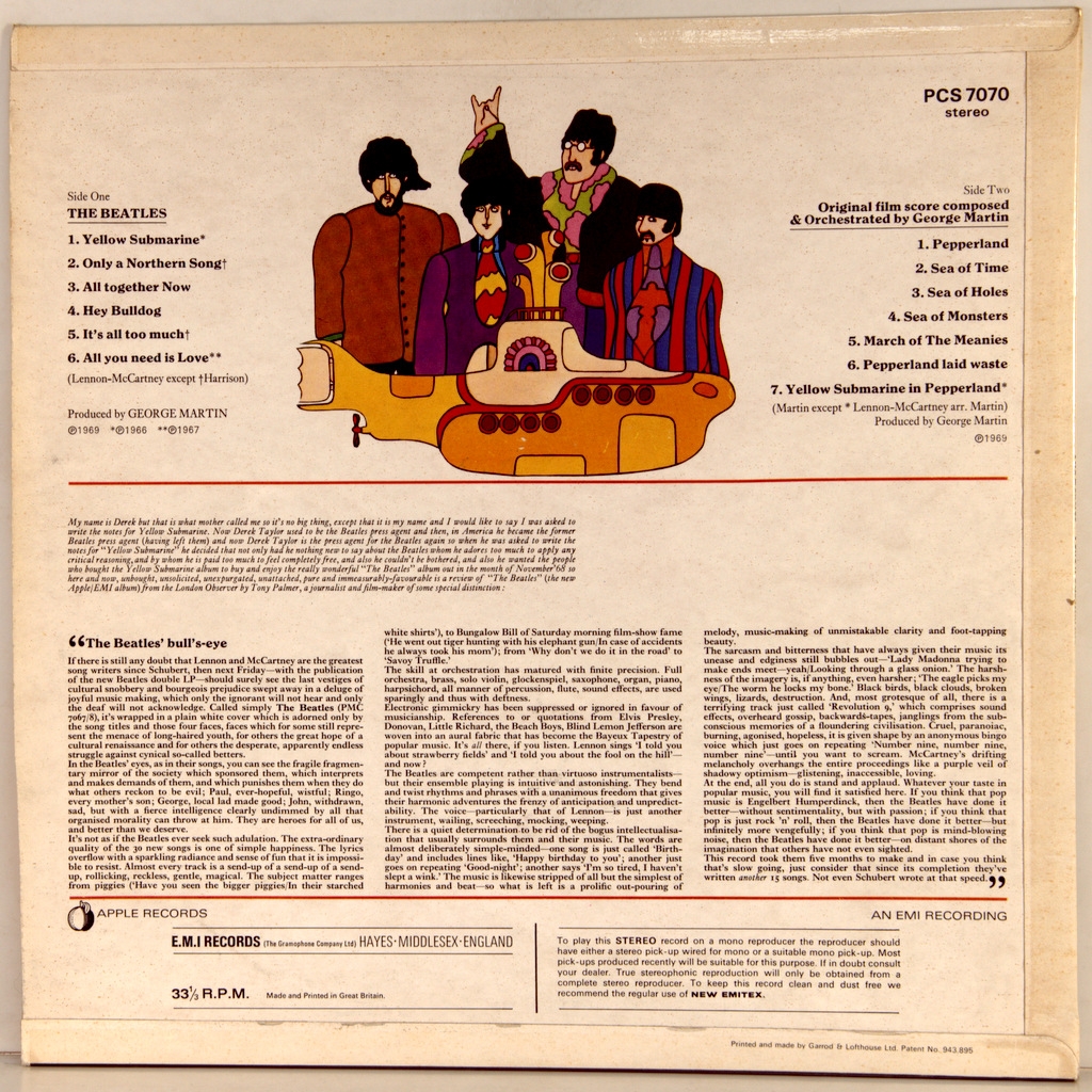 BEATLES-YELLOW SUBMARINE(STEREO)-1969-ПЕРВЫЙ ПРЕСС UK-APPLE- PMC7070 Матричные номера: Сторона 1: XEX 715-1; Сторона 2: XEX 716-1.стампера 1O/1M (Мечта!!!) Yellow Submarine-десятый студийный альбом английской рок-группы The Beatles, выпущенный 13 января 1969 года в Соединенных Штатах и 17 января в Великобритании. Он был выпущен в качестве саундтрека к одноименному анимационному фильму, премьера которого состоялась в Лондоне в июле 1968 года. Альбом содержит шесть песен The Beatles, в том числе четыре новые песни и ранее выпущенные "Желтая субмарина" и "Все, что тебе нужно, это любовь". Оставшаяся часть альбома-это перезапись оркестрового саундтрека фильма продюсером группы Джорджем Мартином. Желтая подводная лодка вошла в топ-5 в Великобритании и США.