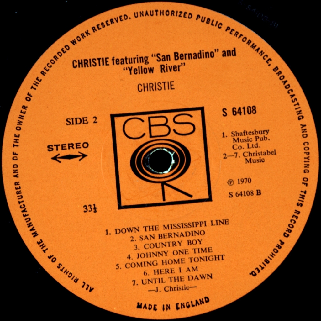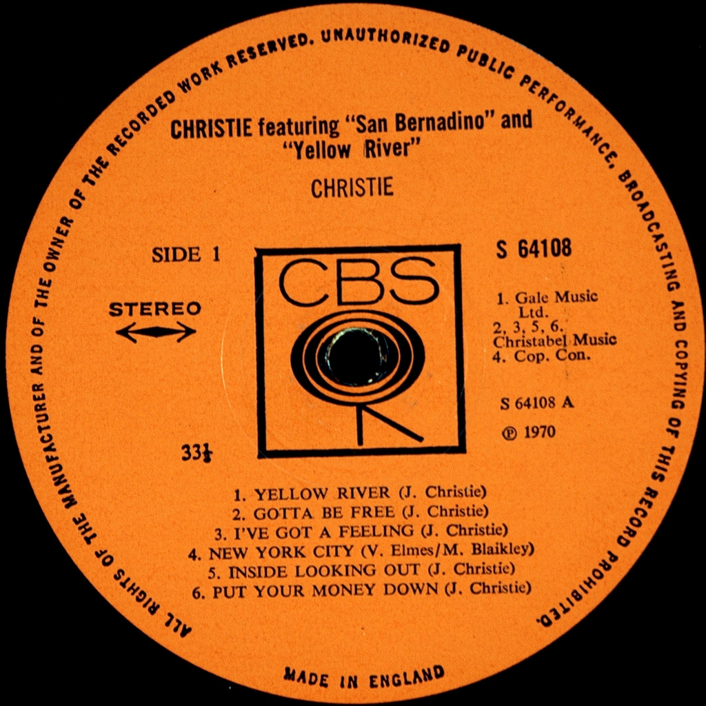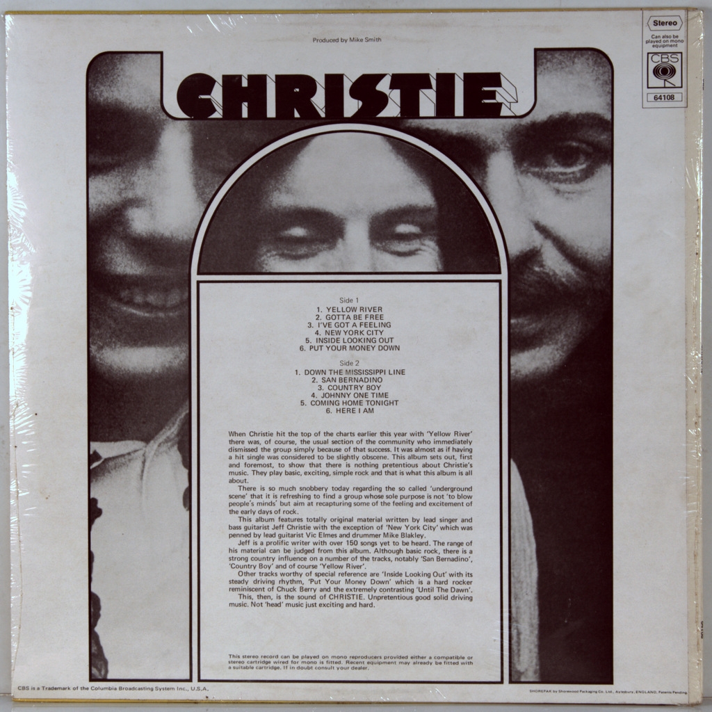 CHRISTIE-CHRISTIE-1970-ПЕРВЫЙ ПРЕСС- UK-CBS номер S64108. Матрицы A-1/B-1. Редкий британский оригинал легендарной группы включающий хит YELLOW RIVER вписанный в историю рок музыки. Christie — британская рок-группа, создана Джеффом Кристи при участии музыкантов группы The Tremeloes, исполнявшая Пауэр-поп с элементами Блюз- и Кантри-рока. Мировую известность ей принесли хиты Yellow River (1970 и If Only.
