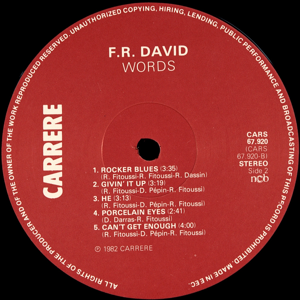 F-R DAVID-WORDS-1982-ПЕРВЫЙ ПРЕСС EU-CARRERA-CARS67920. Редкий оригинал культового альбома диско. Является дебютным альбомом группы Ф. Р. Дэвид. Его заглавный трек, "Слова", стал огромным европейским хитом, достигнув первого места в десяти странах по всему континенту, а также достигнув 2-го места в Великобритании, Франция и Нидерланды.