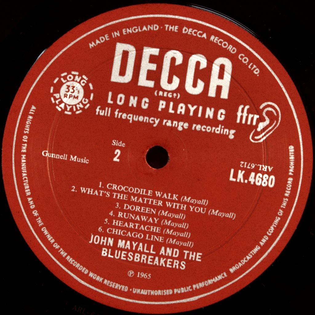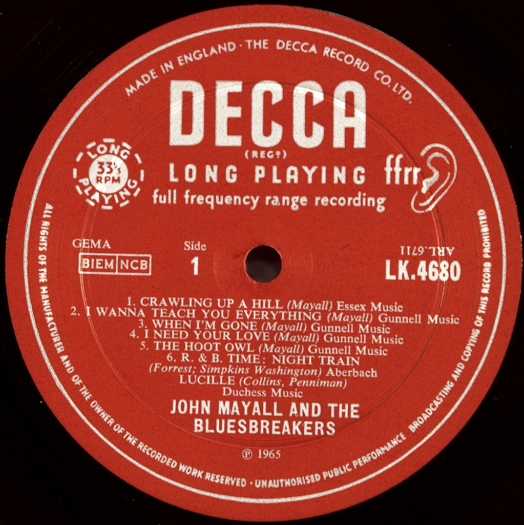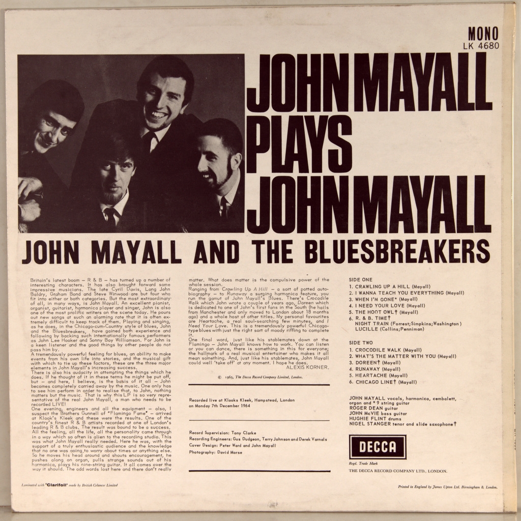 MAYALL, JOHN-PLAYS JOHN MAYALL-1965-ОРИГИНАЛЬНЫЙ ПРЕСС 1967 (MONO) UK-DECCA-LK4680. Матрицы A-2A/B-1A. Мега редкий оригинал культового альбома с матрицами от первого пресса, и дизайном лейбла 1967 года. John Mayall Plays John Mayall - дебютный альбом John Mayall & the Bluesbreakers , выпущенный в 1965 году, Decca LK 4680. Этот альбом был записан в прямом эфире на Klooks Kleek 7 декабря 1964 года. Альбом высоко был оценен критиками и музыкантами, а за Mayall негласно закрепилось "папа белого блюза"
