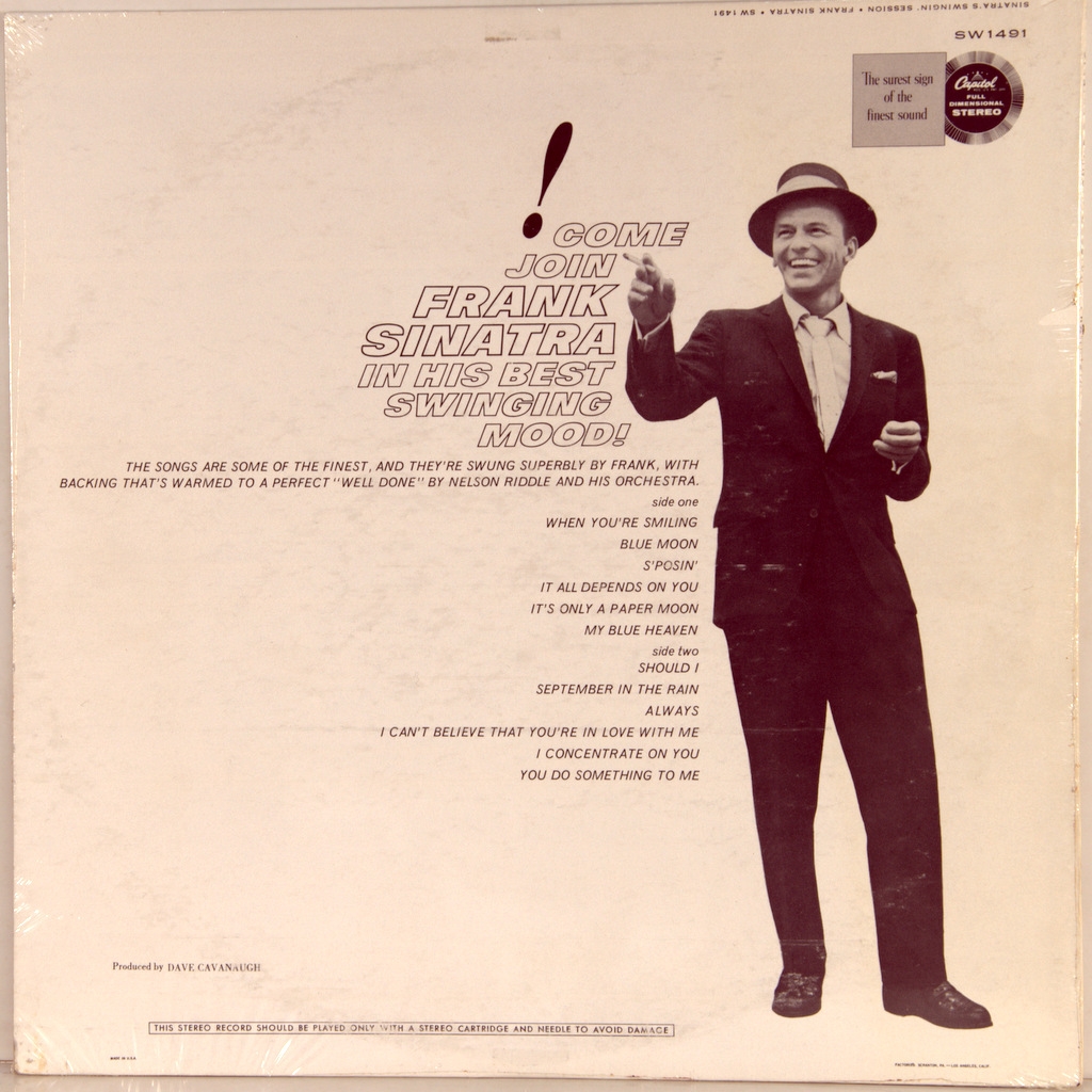 SINATRA, FRANK -SINATRA'S SWINGING SESSION-1961-ПЕРВЫЙ ПРЕСС (STEREO) USA-CAPITOL-SW-1491. Редкий американский оригинал культового альбома. Sinatra Swings (первоначально назывался "Качайся вместе со мной") - альбом Фрэнка Синатры с Билли Мэем и его оркестром, выпущенный в 1961 году. Два названия альбома проистекают из того факта, что Capitol считал, что этот альбом, первоначально названный "Качайся вместе со мной", был так близок по звучанию и названию к более раннему альбому Синатры "Capitol "" Давай качайся со мной!" что лейбл добивался и был удовлетворен судебным постановлением, требующим от Reprise изменить название этого, только его второго альбома Reprise, на Sinatra Swings. Повторной печати не требовалось, чтобы отозвать уже отгруженные пластинки, но пришлось печатать новые этикетки и обложки, На обложке альбома было объявлено, что он содержит "двенадцать самых раскованных вещей Синатры, когда-либо записанных". Треки были аранжированы и дирижированы Билли Мэем и его оркестром. У Синатры был небольшой хит с синглом "Гранада", включенным в этот альбом.