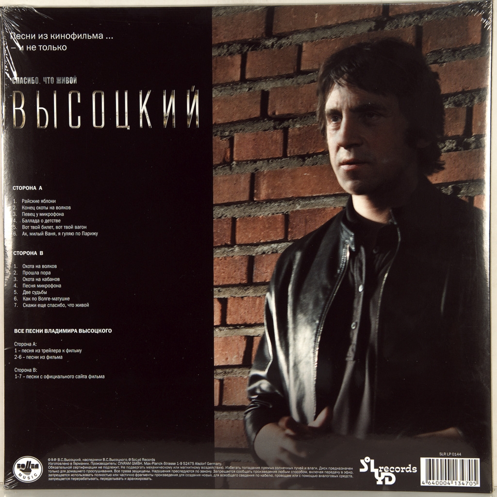 VISSOTSKI VLADIMIR(ВЫСОЦКИЙ ВЛАДИМИР)-СПАСИБО, ЧТО ЖИВОЙ.-2012-ПЕРВЫЙ ПРЕСС -RUSSIA-SOLYD-SLRLP0144. Саундтрек к знаменитому фильму . «Высоцкий. Спасибо, что живой» — российский биографический фильм режиссёра Петра Буслова о нескольких драматических днях из жизни Владимира Высоцкого. Сценаристом фильма является Никита Высоцкий, сын Владимира Высоцкого. Среди снятых в России в 2011 году 69 кинофильмов фильм «Высоцкий. Спасибо, что живой» имел наивысшие кассовые сборы — 27,5 млн долларов