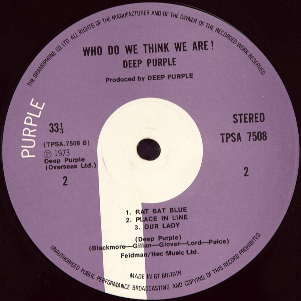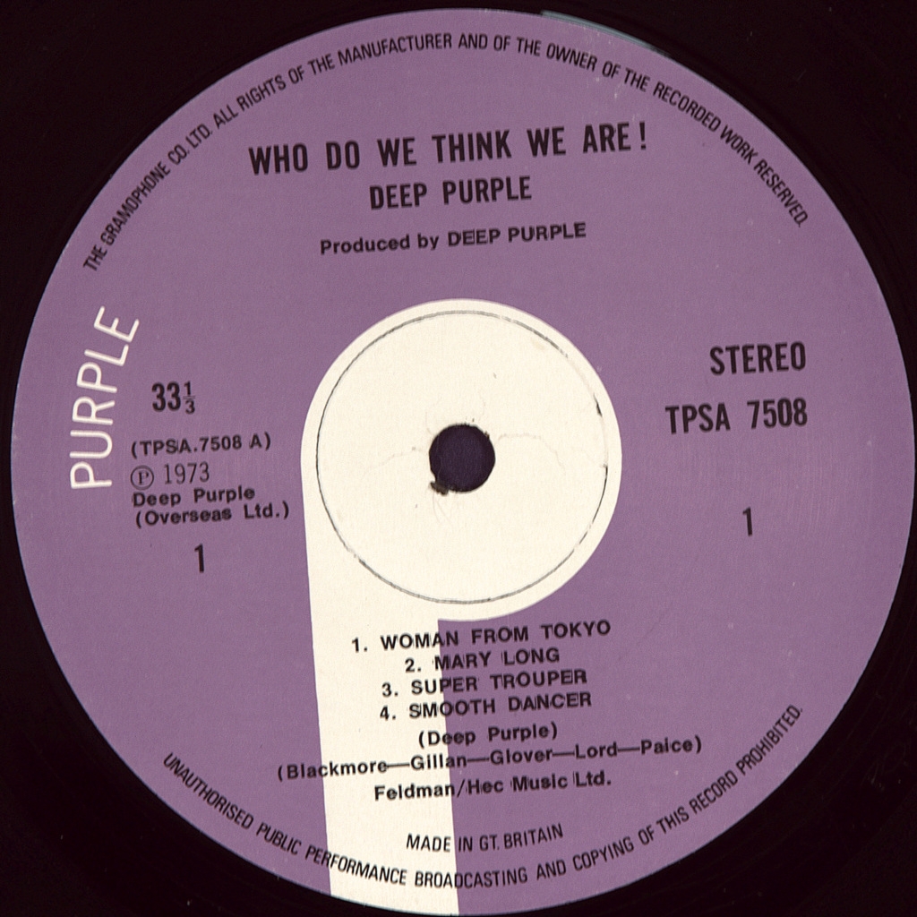 DEEP PURPLE-WHO DO WE THINK WE ARE-1973-первый пресс uk-purple rec.-TPSA7508. Матрицы A-1U/B-1U . стампера 1T/2GP (Очень рано) Редкий британский оригинал культового альбома. Who Do We Think We Are — седьмой студийный альбом британской группы Deep Purple, вышедший в 1973 году. Последний альбом Deep Purple c вокалистом Иэном Гилланом и басистом Роджером Гловером до выхода в 1984 году Perfect Strangers. Запись диска проходила в июле 1972 года в Риме[4] и в октябре того же года во Франкфурте с использованием передвижной студии Rolling Stones Mobile Studio.Группа в тот период была раздираема внутренними конфликтами и запись альбома превратилась в сущий кошмар[4]. Ян Гиллан впоследствии сравнивал этот альбом с The House of Blue Light 1987 года: «Всё то же самое: отличные песни, но полное отсутствие взаимопонимания у музыкантов и… слабый моральный дух».Who Do We Think We Are не поднялся выше 4-й позиции в Великобритании и 15-й в чартах США. Тем не менее, Deep Purple оставались одним из самых коммерчески успешных проектов в мире благодаря альбомам Machine Head и Made in Japan, а также многочисленным гастролям.