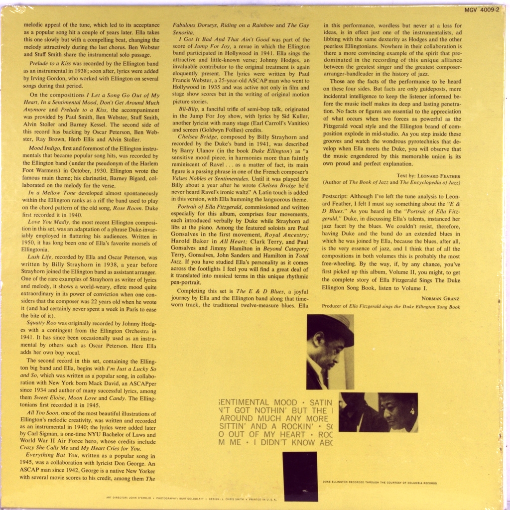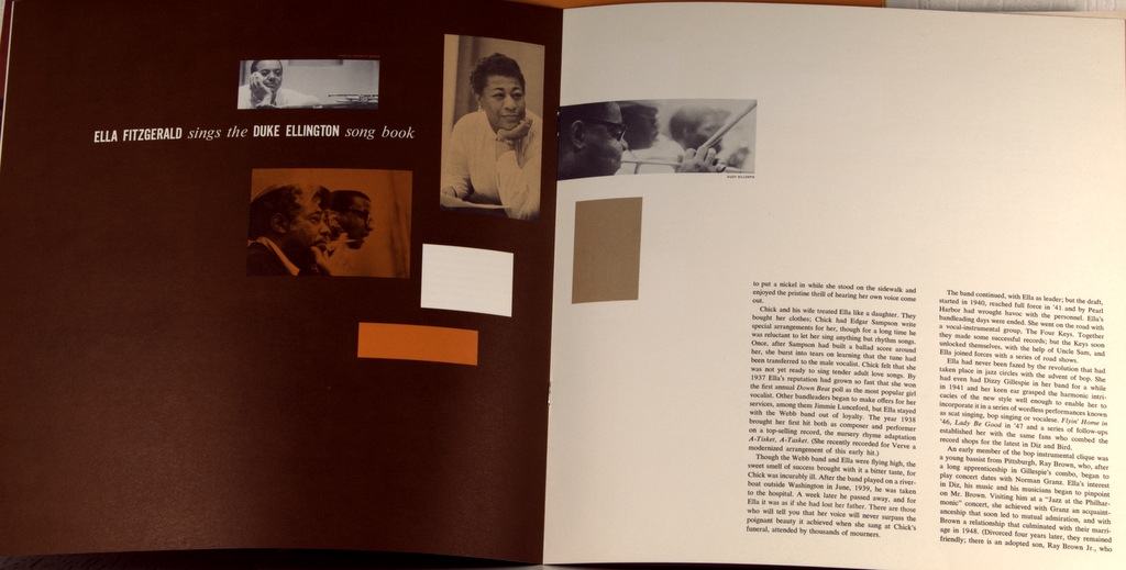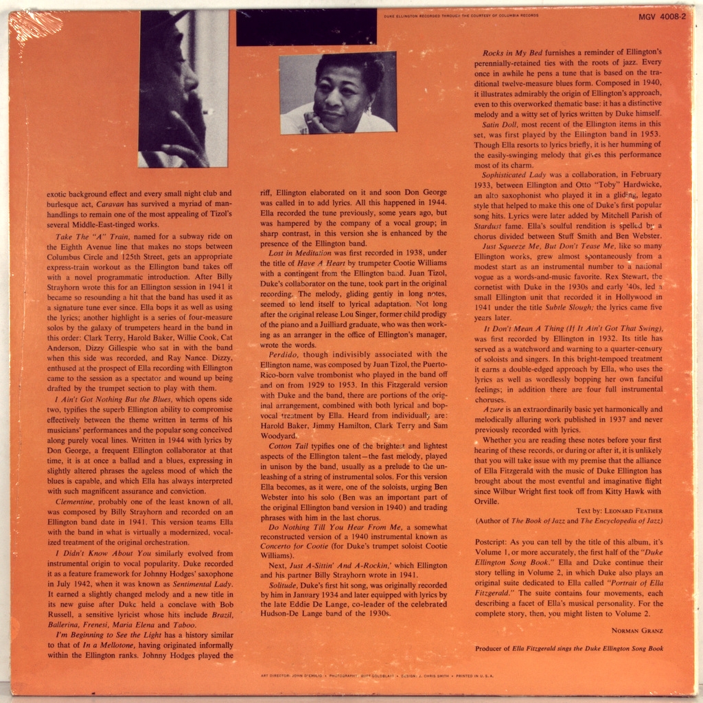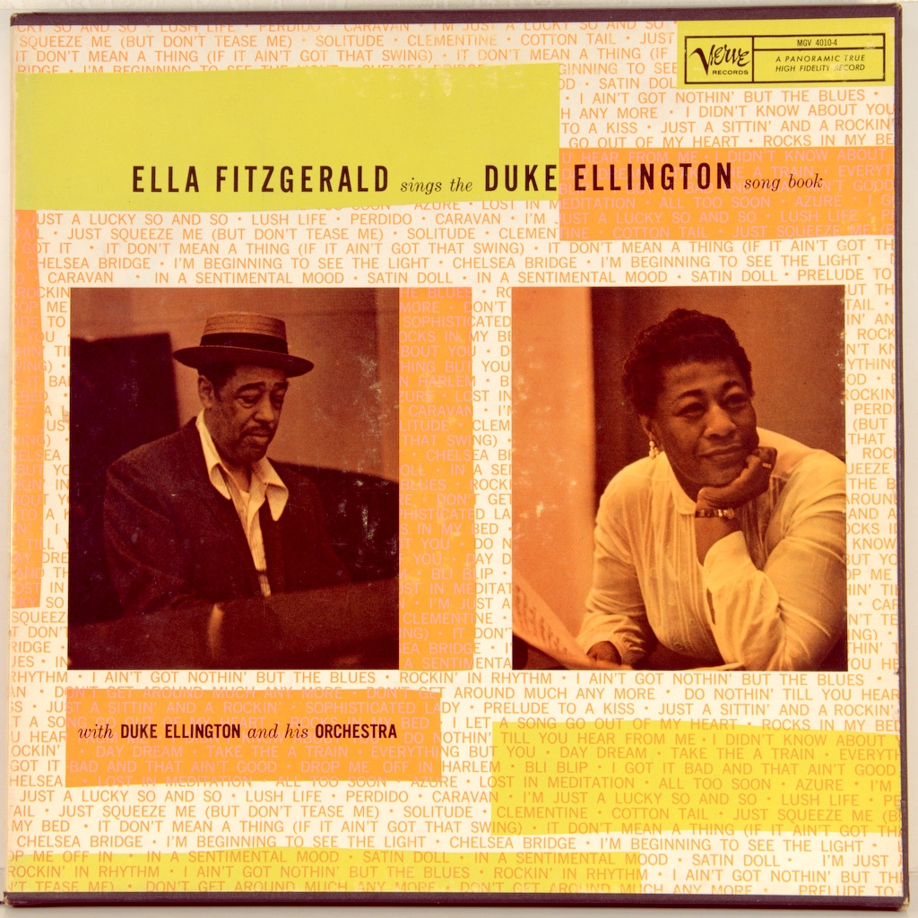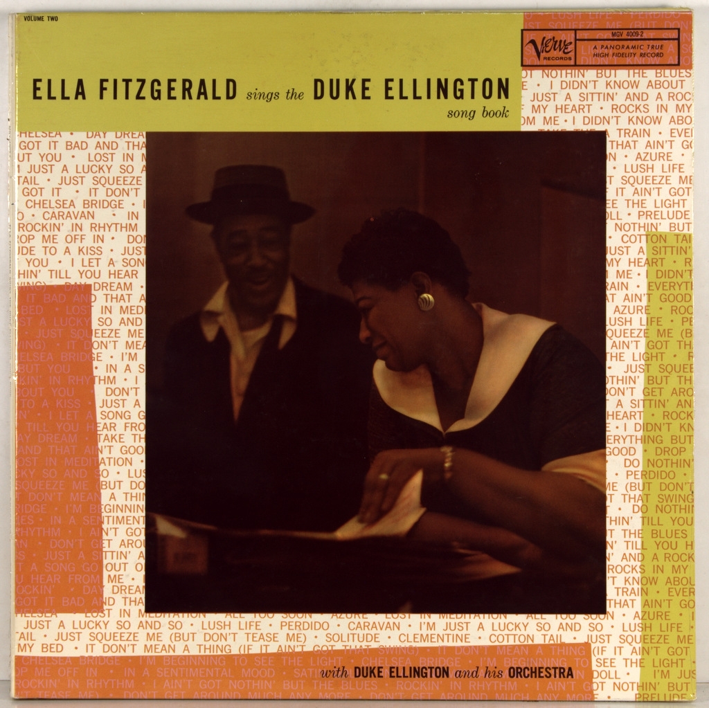 ELLINGTON, DUKE / FITZGERALD, ELLA - ELLA SINGS THE ELLINGTON (BOX 2 X 2LP) -1957-ПЕРВЫЙ ПРЕСС (МОНО) USA-VERVE-MGV4010-4. Редкий американский оригинал знаменитого альбома. Студийный альбом 1957 года американской джазовой певицы Эллы Фитцджеральд в сопровождении Дюка Эллингтона и его оркестра, посвященный песням Эллингтона. Часть серии "Песенник" Фицджеральд, это единственная, где композитор также фигурирует в качестве исполнителя, и первый раз, когда Фицджеральд записалась с Эллингтоном. Это также запись в серии Песенников, которая предоставила ей больше всего возможностей продемонстрировать свое мастерство в пении scat. Большая часть третьего диска посвящена двум оригинальным композициям Билли Стрейхорна, вдохновленным жизнью, характером и артистизмом Фицджеральд. Запись Фитцджеральд на этом альбоме принесла ей премию "Грэмми" за лучшее индивидуальное джазовое исполнениена 1-й ежегодной премии "Грэмми". Альбом был выпущен в двух томах: В первом томе был Фицджеральд с оркестром Эллингтона, во втором-Фицджеральд с небольшой группой. Этот альбом ознаменовал начало плодотворных творческих отношений Фицджеральд и Эллингтона. В 1960-е годы они выступят на Лазурном берегу с альбомом "Элла и Дюк на Лазурном берегу" (1966), а также в Швеции на концерте в Стокгольме в 1966году. и другой студийный альбом - "Элла у Дьюка" (1965).