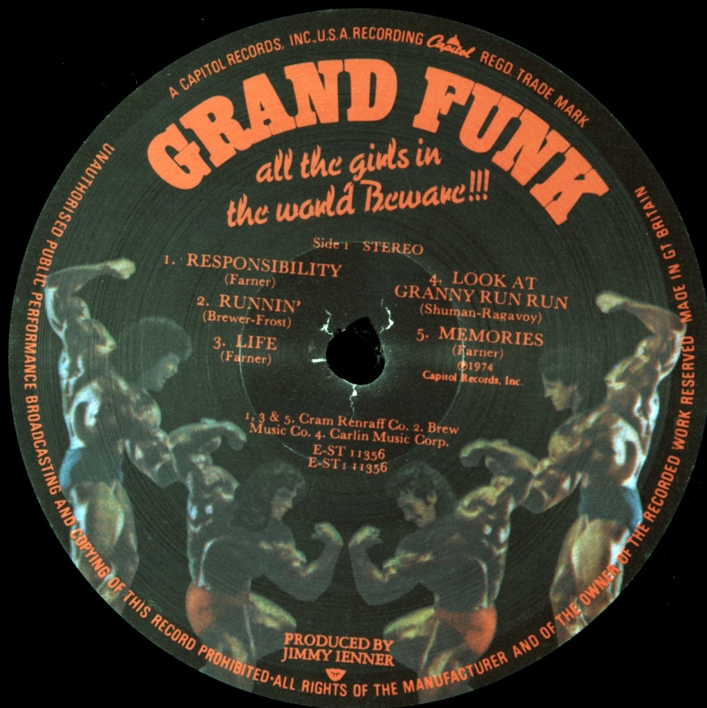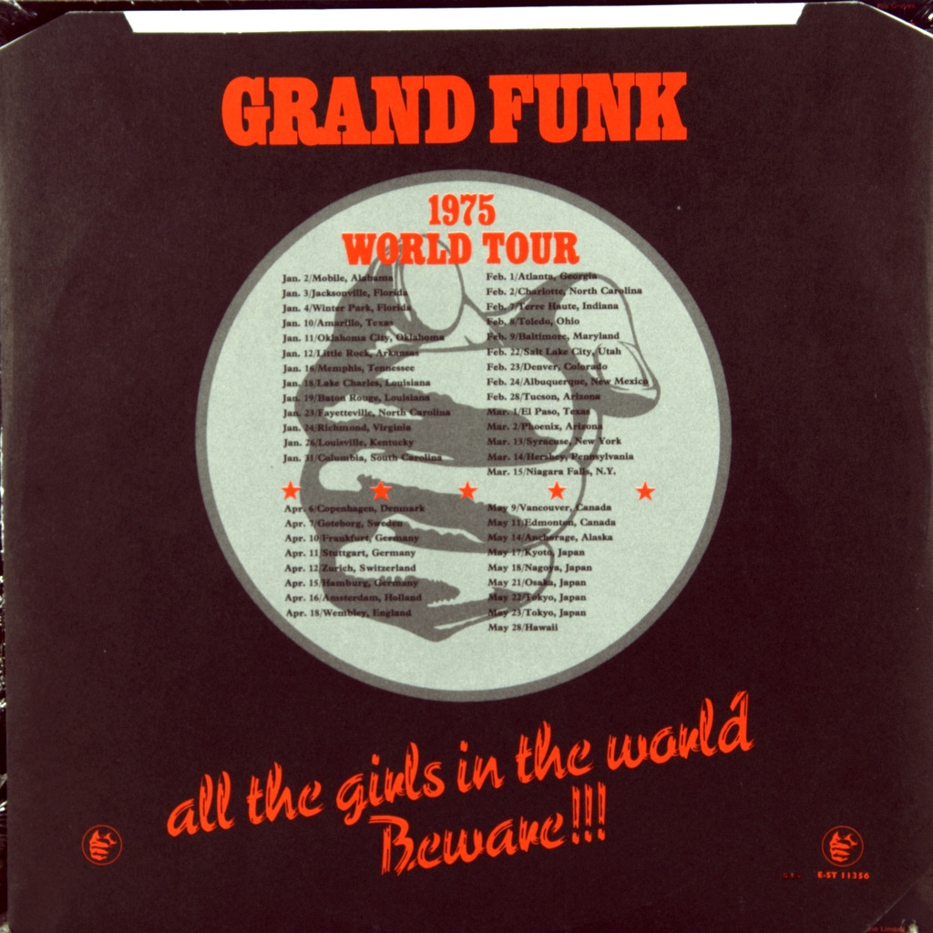 GRAND FUNK RAILROAD-ALL THE GIRLS IN THE WORLD BEWARE!!!-1974-ПЕРВЫЙ ПРЕСС UK-CAPITOL-E-ST-11356. Редкий британский оригинал культового альбома. Это девятый студийный альбом американской хард-рок-группы Grand Funk Railroad. Альбом был выпущен Capitol Records в декабре 1974года[1] и стал вторым альбомом группы, выпущенным в том же году. Первый сингл с альбома, "Some Kind of Wonderful", был выпущен 16 декабря 1974 года, а его продолжение, "Bad Time", вышло 24 марта 1975 года.