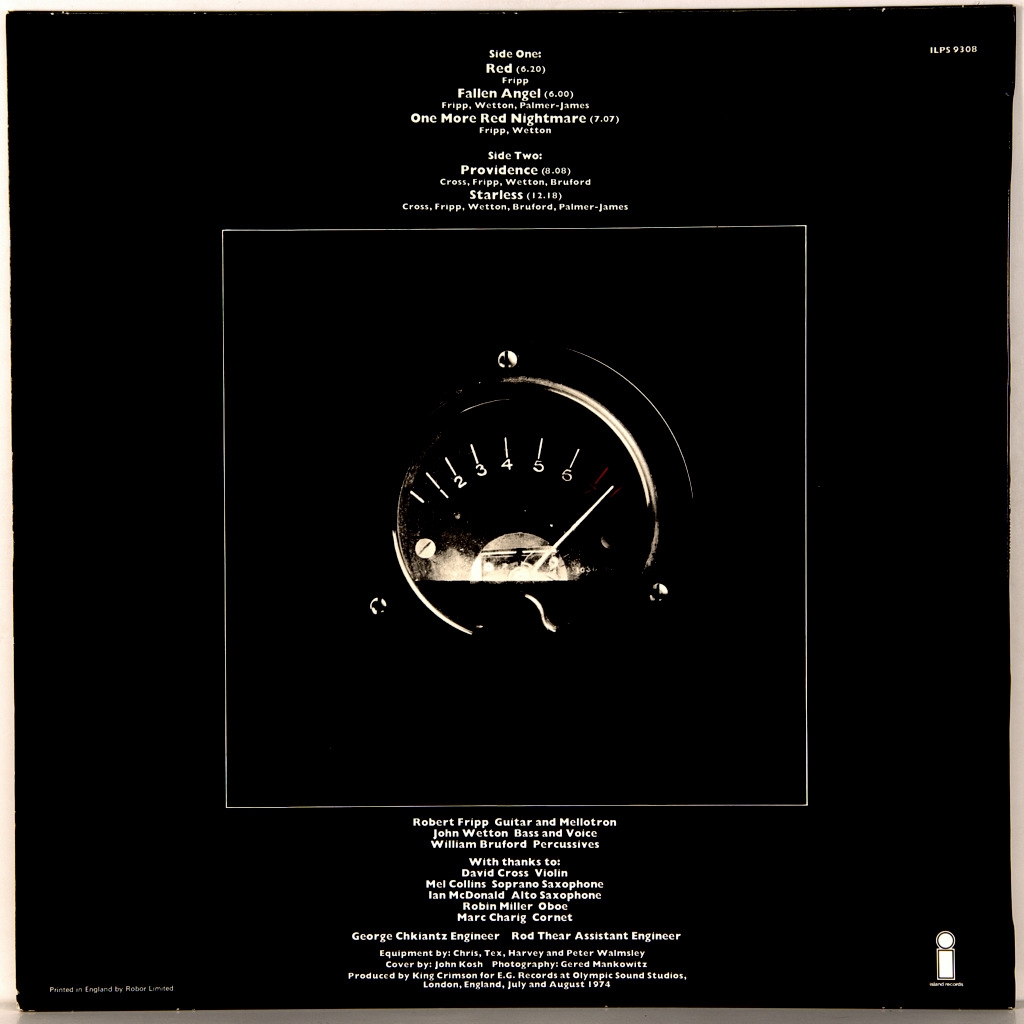 KING CRIMSON-RED-1974-ПЕРВЫЙ ПРЕСС UK-ISLAND-Матрицы A-3U/B-6U SEAN/PESKO. Стампера 2RA/1RM (Очень рано!) Очень редкий британский оригинал культовой прог группы. Red — седьмой студийный альбом британской группы King Crimson, выпущенный в ноябре 1974 года лейблом Island Records в Великобритании и лейблом Atlantic Records в США. Это последний альбом King Crimson, записанный в 1970-е годы. Занимает 8 место в списке Топ-25 лучших альбомов прогрессивного рока по версии Progarchives.com и 7 место в списке «25 лучших классических альбомов прогрессивного рока» по версии PopMatters.