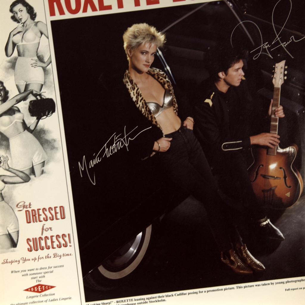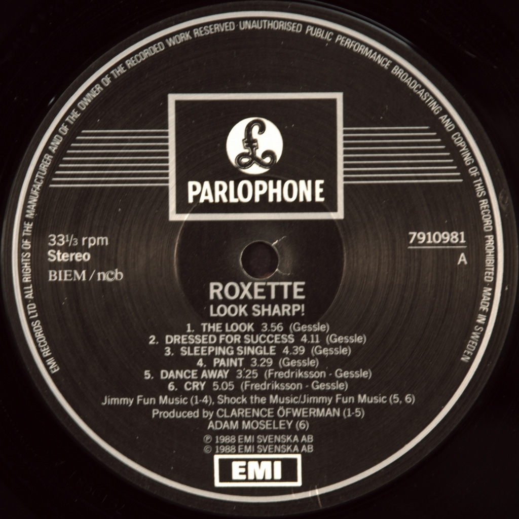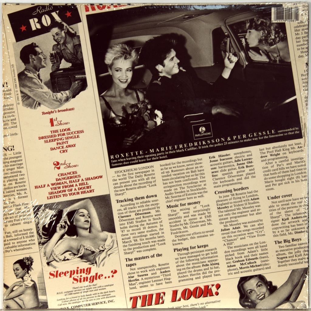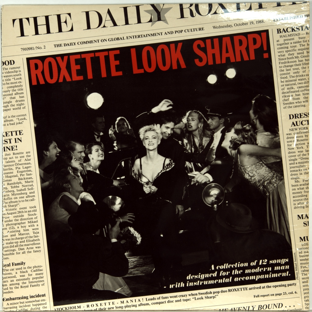 ROXETTE-LOOK SHARP!-1988-ПЕРВЫЙ ПРЕСС SWEDEN-PARLOPHONE - 7910981. Редкий шведский оригинал легендарной группы. Это прорывной альбом Roxette, включающий такие песни как «The Look», «Dressed for Success», «Dangerous» и «Listen to Your Heart», которые были выпущены в качестве синглов и стали популярными хитами во всем мире. На обложке изображены Per Gessle и Marie Fredriksson, прорывающиеся через толпу поклонников, для того, чтобы сесть в чёрный лимузин марки Cadilac. Чтобы популярный дуэт сел в машину, полиции потребовалось 25 минут для «расчистки» пути.