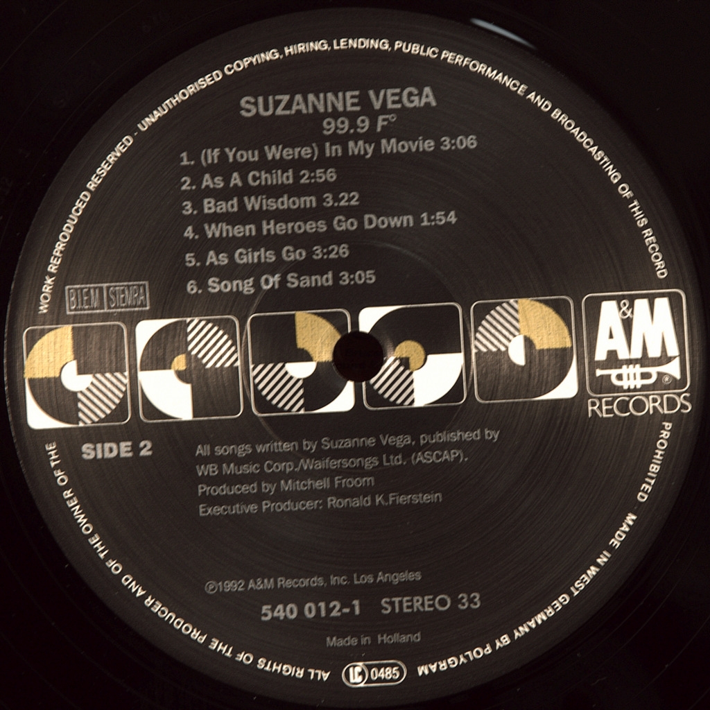 SUZANNE VEGA-99-9 F-1992-ПЕРВЫЙ ПРЕСС EU-HOLLAND-AM-540012-1. Очень редкий оригинал американской фолк звезды.99.9F° — четвёртый студийный альбом американской фолк-певицы Сюзанны Веги, выпущенный в сентябре 1992 года. Он получил положительные отзывы музыкальной критики в США. В США альбом получил золотой статус RIAA. Продюсер этого диска Митчелл Фрум (Mitchell Froom, ставший мужем певицы в 1996—1998 годах) был в 1993 году за него номинирован на премию Грэмми в категории Продюсер года .