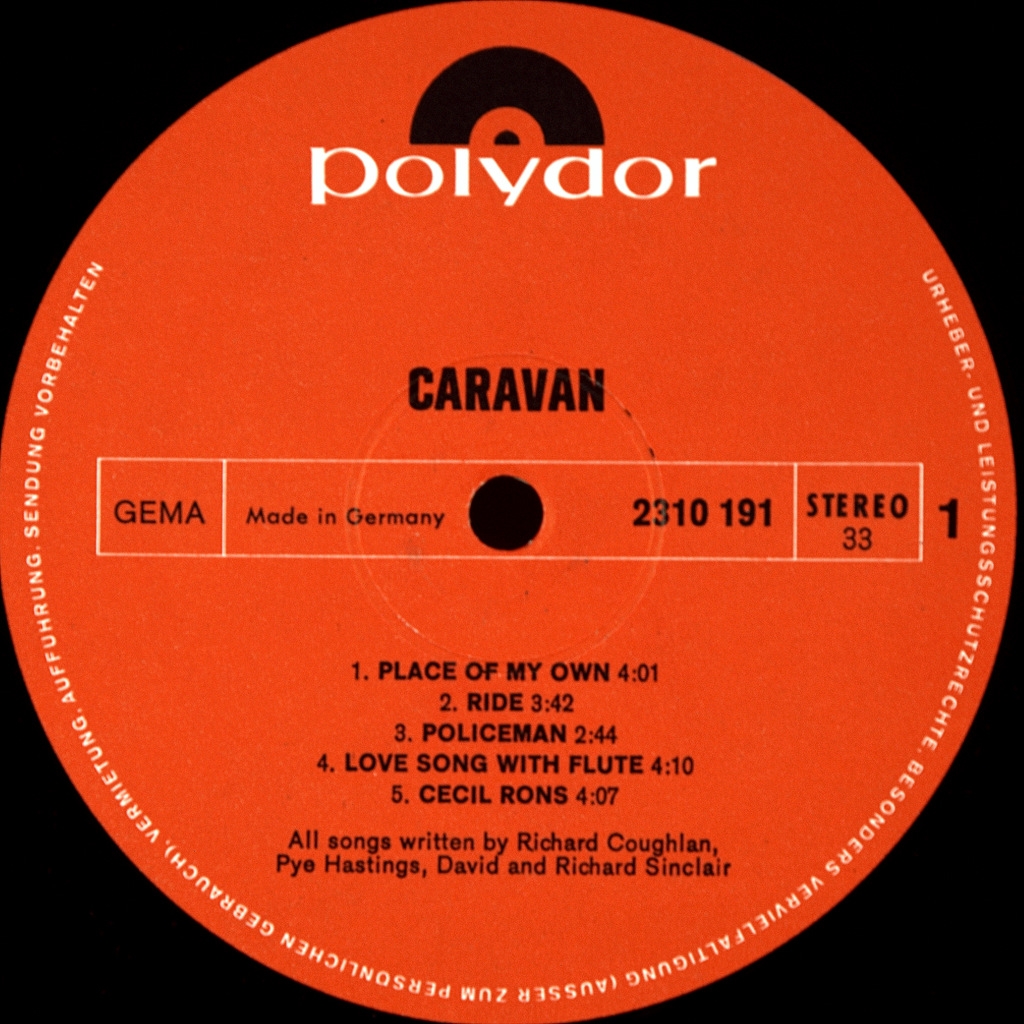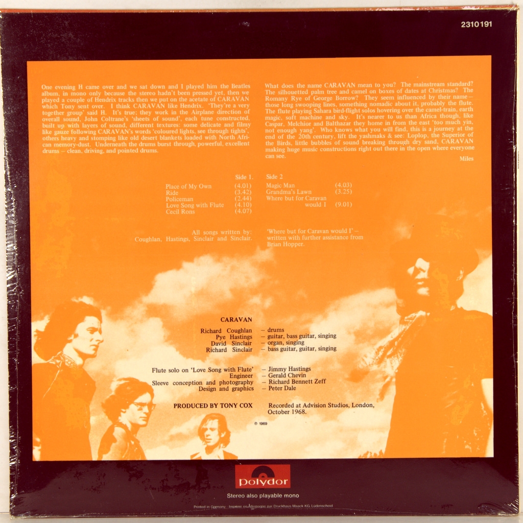 CARAVAN-CARAVAN-1969-ОРИГИНАЛЬНЫЙ ПРЕСС 1972 GERMANY-POLYDOR-2310191. Редкое раннее издание культового альбома. Caravan — британская группа кентерберийской сцены, образованная в 1968 году бывшими участниками группы The Wilde Flowers Паем Хастингсом (вокал, гитара), Ричардом Синклером (вокал, бас-гитара), Дэвидом Синклером (клавишные) и Ричардом Кафланом (барабаны).Первый альбом группы Caravan (1968) был гибридом поп-музыки, джаза и психоделии, сыграв важную роль как в становлении звучания группы, так и формировании особенностей музыкальной школы Кентербери в целом. Альбом включал первый фирменный психоделический джем группы «Where But For Caravan Would I»