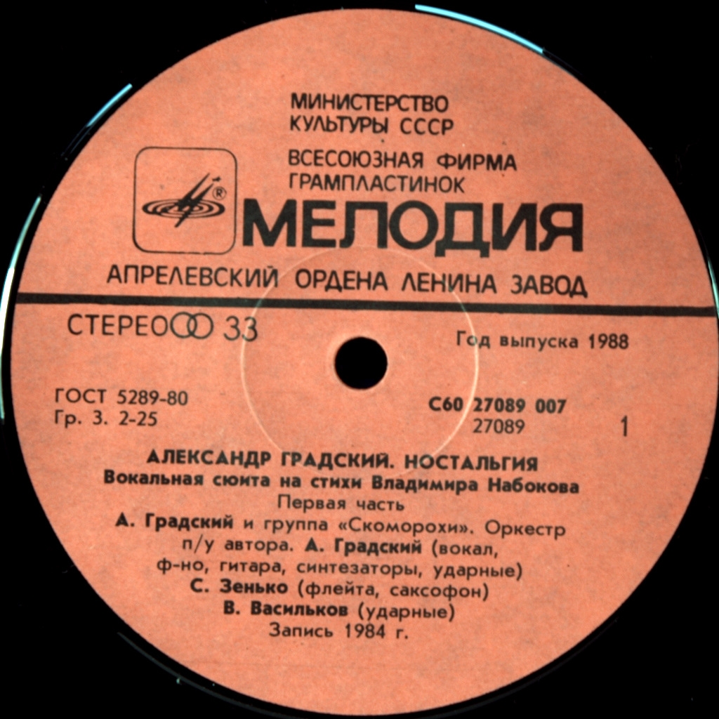 ГРАДСКИЙ, АЛЕКСАНДР -НОСТАЛЬГИЯ -1988-ПЕРВЫЙ ПРЕСС USSR-MELODIA-C6027089007. Редкий оригинал культового альбома. Ностальгия (вокальная сюита на стихи Владимира Набокова, музыка А. Градского, запись 1984 г.Александр Бори́сович Градский (при рождении Фрадкин; род. 3 ноября 1949, Копейск, Челябинская область, РСФСР, СССР) — советский и российский певец, мультиинструменталист, автор песен, поэт, композитор. Один из основоположников русского рока. Заслуженный деятель искусств Российской Федерации (1997). Лауреат Государственной премии РФ (1999). Народный артист Российской Федерации (1999). Народный артист Приднестровской Молдавской Республики (2014). Художественный руководитель театра «Градский Холл».