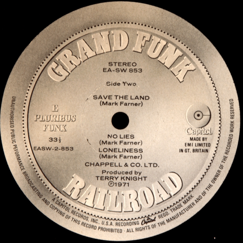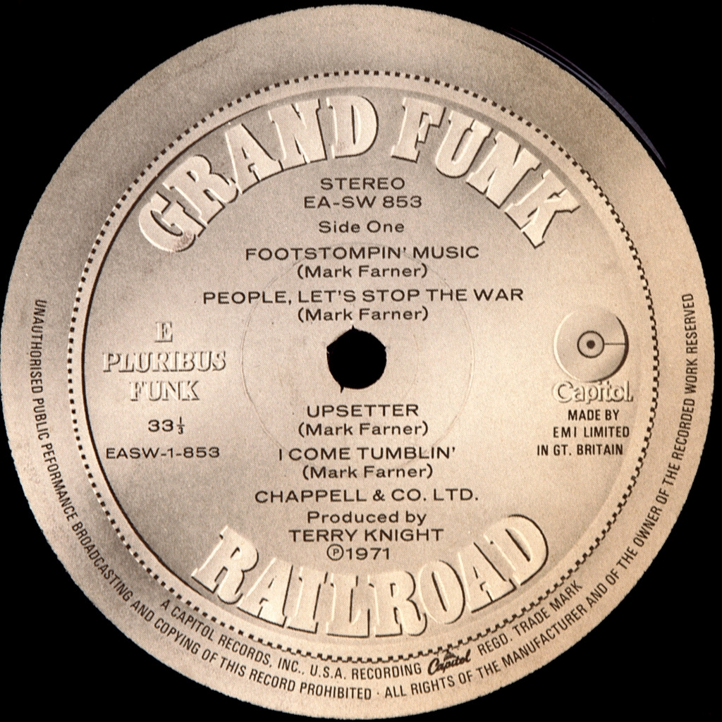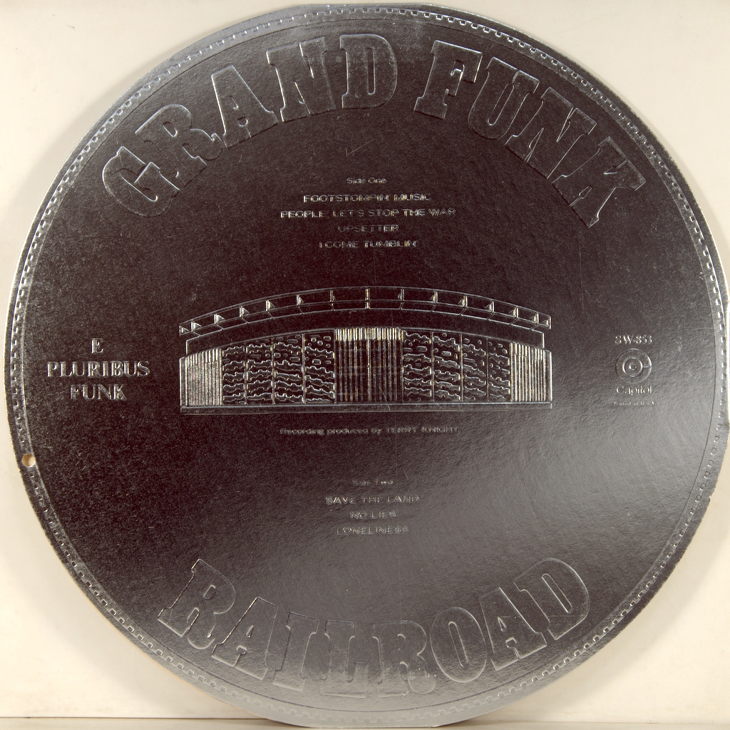 GRAND FUNK RAILROAD-E PLURIBUS FUNK-1972-ПЕРВЫЙ ПРЕСС UK-CAPITOL-EASW-2853. Редкий британский оригинал культового альбома . E Pluribus Funk - пятый студийный альбом американской рок-группы Grand Funk Railroad. Альбом был выпущен 15 ноября 1971 года лейблом Capitol Records. Как и предыдущие альбомы Grand Funk Railroad, он был записан в Cleveland Recording Company и является последним альбомом, спродюсированным Терри Найтом. Название представляет собой игру на девизе Соединенных Штатов Америки, E pluribus unum, и на латыни означает "Из многих, Фанк". Оригинальная выпускная крышка (дизайн Эрни Чефалу) была совершенно круглой и покрыта серебристой пленкой, напоминавшей большую монету. Задняя сторона обложки этого альбома включала в себя литое изображение стадиона Ши. Альбом был очень успешным разместившись в чартах второй десятке многих стран.