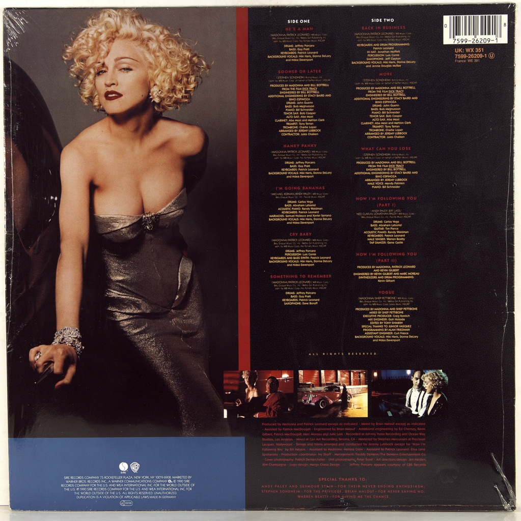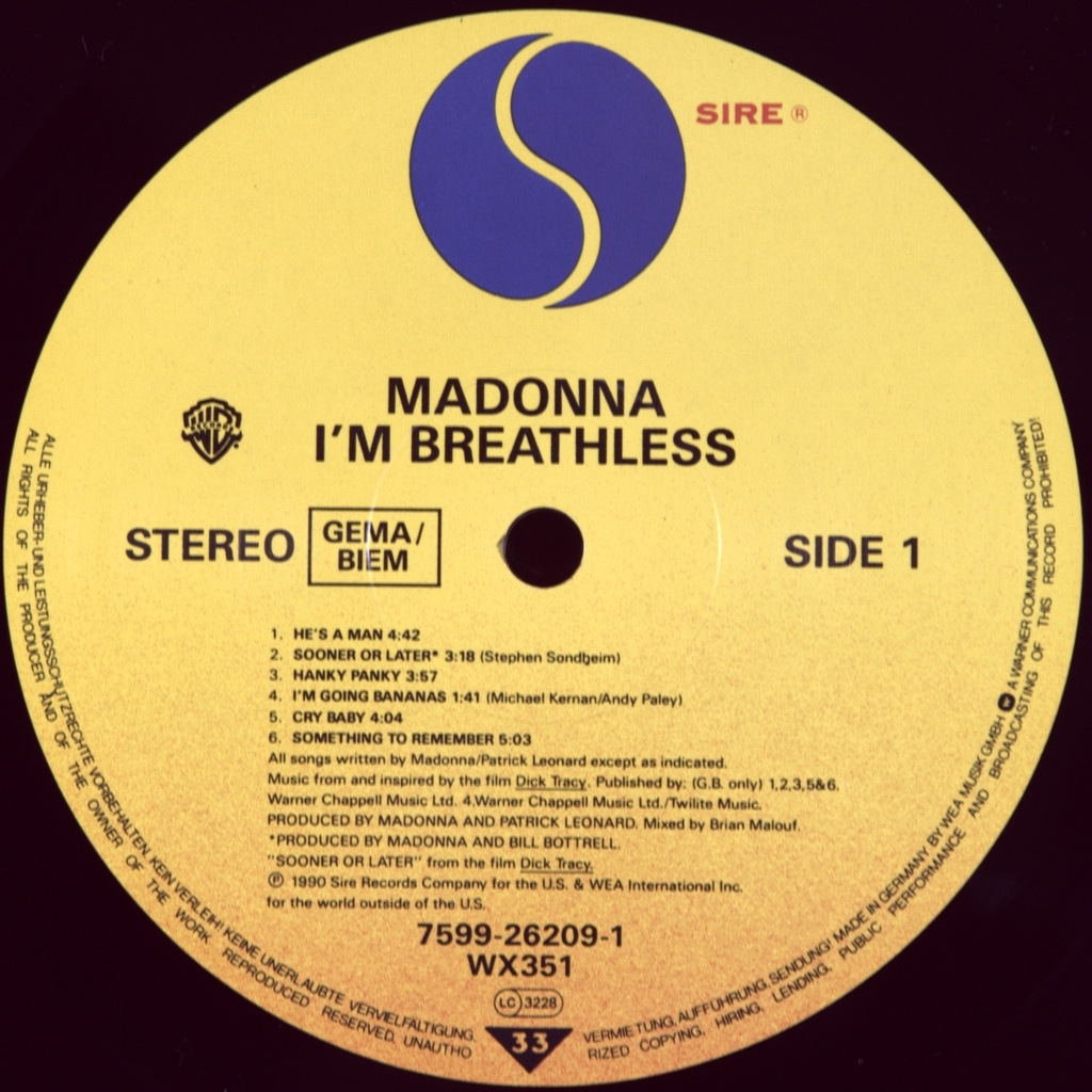 MADONNA-I'M BREATHLESS-1990-ПЕРВЫЙ ПРЕСС GERMANY-SIRE/WARNER-7599-26209-1. Редкий европейский оригинал королевы поп музыки. I’m Breathless: Music from and Inspired by the Film Dick Tracy — саундтрек американской певицы Мадонны, выпущенный 22 мая 1990 года, записан в целях промоушена фильма Дик Трейси, выпущенного летом 1990 года. Диск смешивает номерные саундтреки и песни, вдохновленные фильмом. Этот альбом был коммерчески успешным, он достиг десятки лучших в Billboard 200 в США, а также в ряде других стран. Ассоциация звукозаписывающей индустрии Америки (RIAA) обозначила его как золотой, платиновый и двукратно платиновый 30 июля 1990 года, после двух миллионов продаж в США: он был продан тиражом более 7 миллионов копий по всему миру.