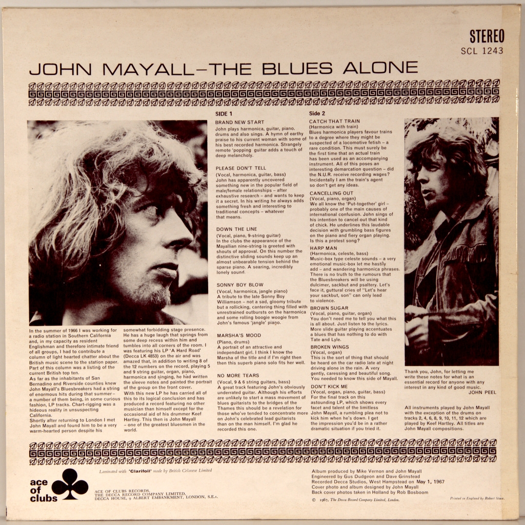 MAYALL, JOHN-THE BLUES ALONE-1967-ПЕРВЫЙ ПРЕСС UK-DECCA-SCL1243. Матрицы A-1W/B-1W. Редкий британский оригинал культового блюз рокера. The Blues Alone-это альбом электрического блюза 1967 года, записанный Джоном Мэйаллом, на котором он сам записал все партии, За исключением перкуссии, которая была предоставлена давним соавтором Кифом Хартли . Обложка и оригинальный дизайн тоже разработал сам Джон Майалл.
