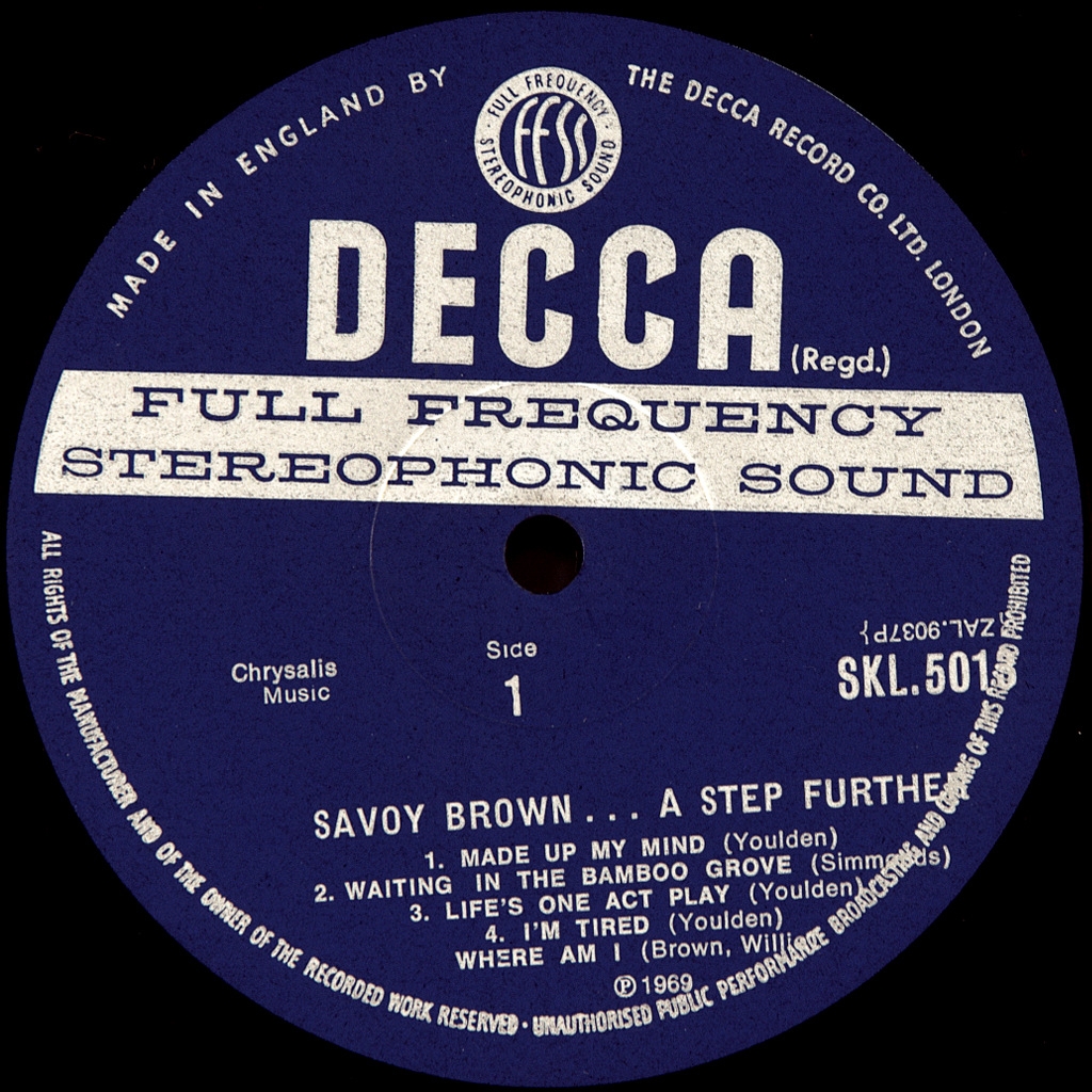 SAVOY BROWN-A STEP FUTHER-1969-ПЕРВЫЙ ПРЕСС UK-DECCA-SKL5013 Матрицы A-1W/B-1W. Редкий британский оригинал культовой блюз-роковой группы. A Step Further - четвертый альбом группы Savoy Brown. Он был выпущен компанией Decca в Великобритании и Parrot в США в сентябре 1969 года. Это последний альбом, записанный с давним пианистом Бобом Холлом. Трек альбома "Made Up My Mind" впервые появился как Би-сайд американского сингла на лейбле Parrot Records 45-40039 (выпущен в июне 1969 года), сопровождаемый "Train to Nowhere" с их альбома Blue Matter. Трек "Waiting in the Bamboo Grove" позже будет выпущен как би-сайд британского сингла Decca F 13019 (выпущен в мае 1970 года) "A Hard Way To Go" с их альбома. Raw siena. Side Two была записана вживую в Cooks Ferry Inn, Эдмонтон, Лондон, 12 мая 1969 года. Он значительно лучше показал себя в США, где провел 10 недель в Billboard 200, достигнув 71-го места.