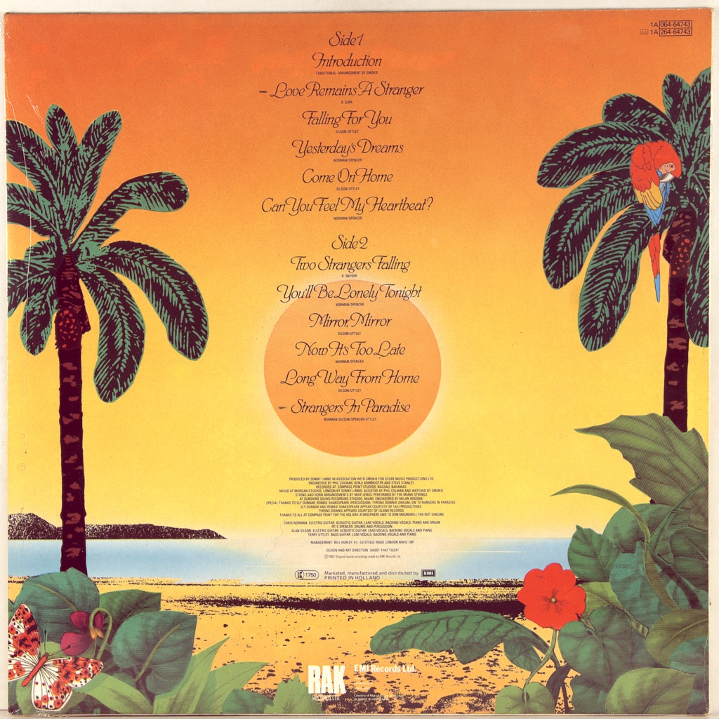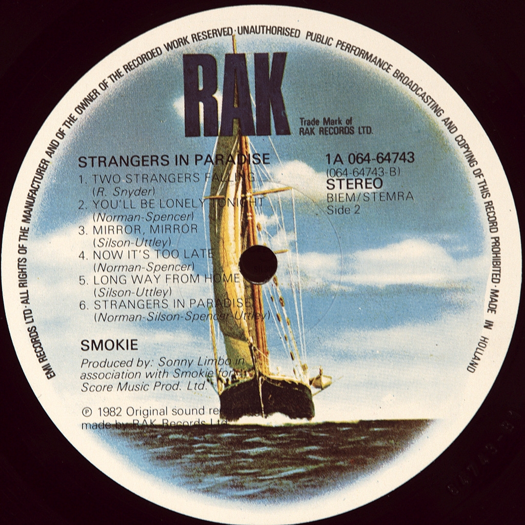SMOKIE-STRANGERS IN PARADISE-1982-ПЕРВЫЙ ПРЕСС HOLLAND-RAK- 1A-064-64743. Матрицы A-1/B-1 . Редкий европейский оригинал. В начале 1982 года был выпущен последний альбом для EMI Strangers in Paradise. Альбом провалился в чартах, и стало ясно, что участники не смогли воссоздать свой успех, используя собственный материал. Вскоре после выхода Strangers in Paradise началась работа над двумя альбомами, один из которых вышел как альбом Smokie Midnight Delight, а другой — сольный альбом Криса Нормана Rock Away Your Teardrops. Но что альбом Smokie, что сольник Нормана продавались плохо. Удивительно, как время многое меняет, в настоящее время альбом считается одним из самых редких и желанных у поклонников группы.