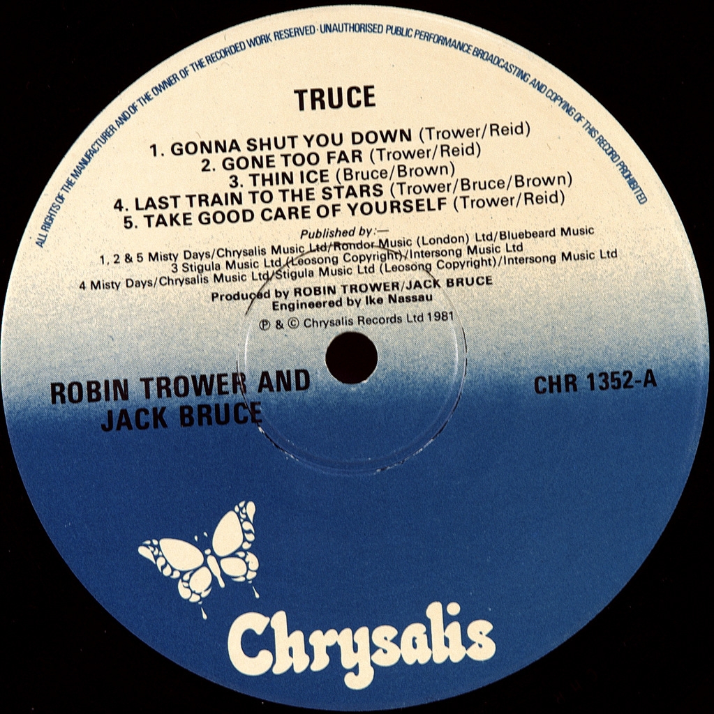 TROWER, ROBIN (EX-PROCOL HARUM) AND JACK BRUCE -TRUCE -1981-ПЕРВЫЙ ПРЕСС (PROMO) UK-CHRYSALIS-CHR-1352. Редкий британский оригинал культового альбома легендарного гитариста PROCOL HARUM. TRUCE - студийный альбом 1982 года Джека Брюса и Робина Троуэра. Альбом достиг 109 места в Billboard 200.