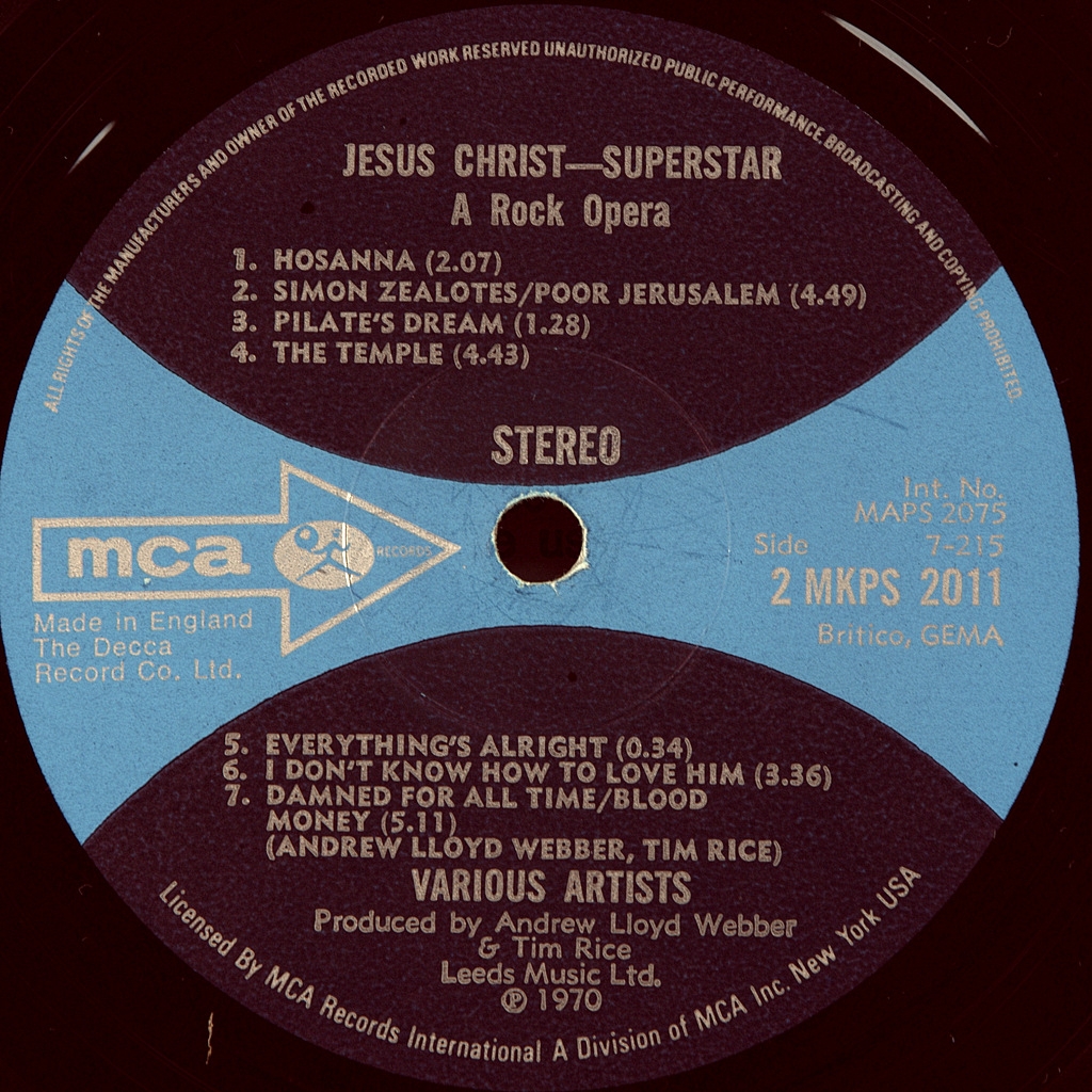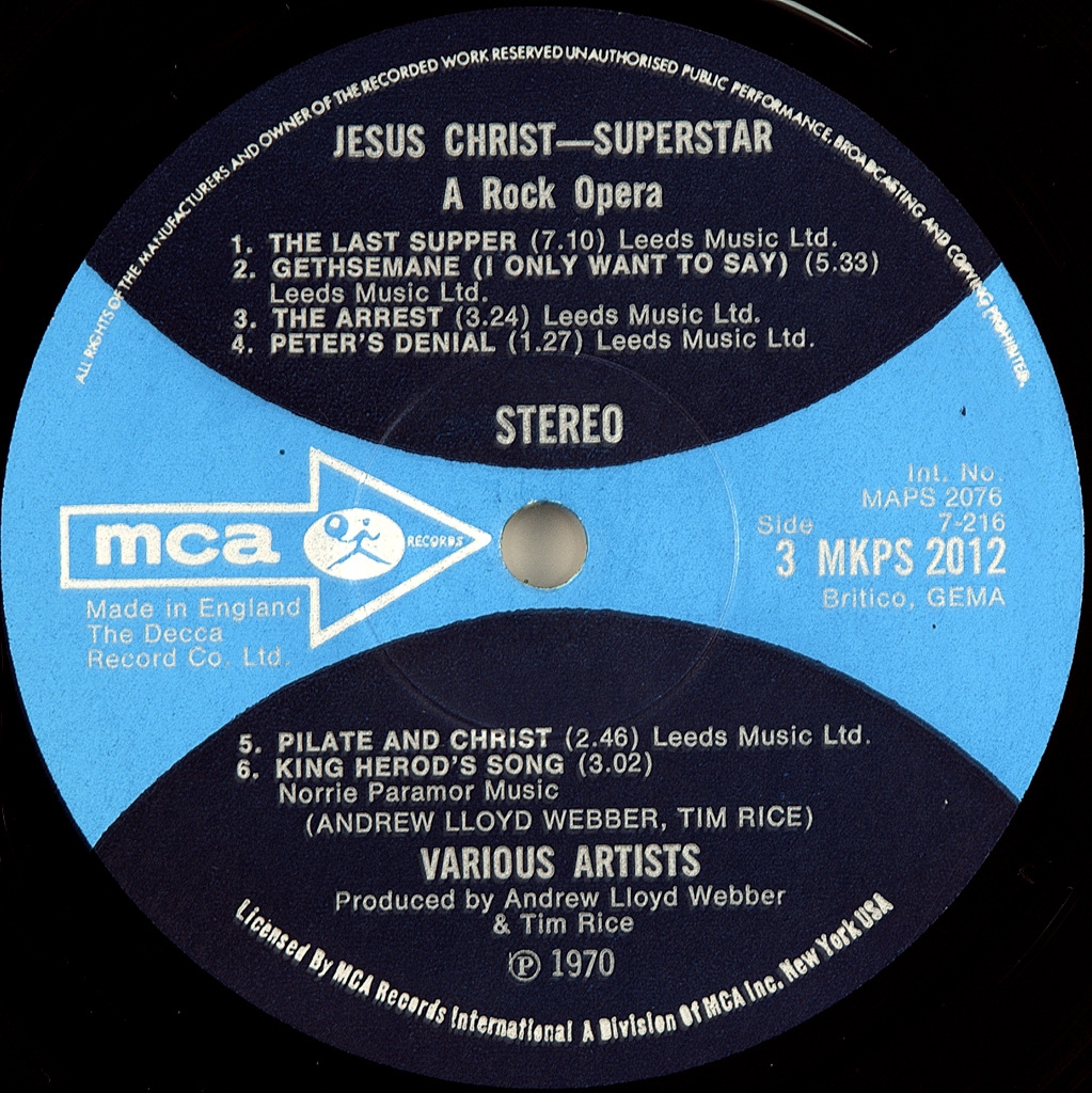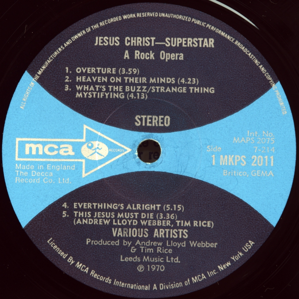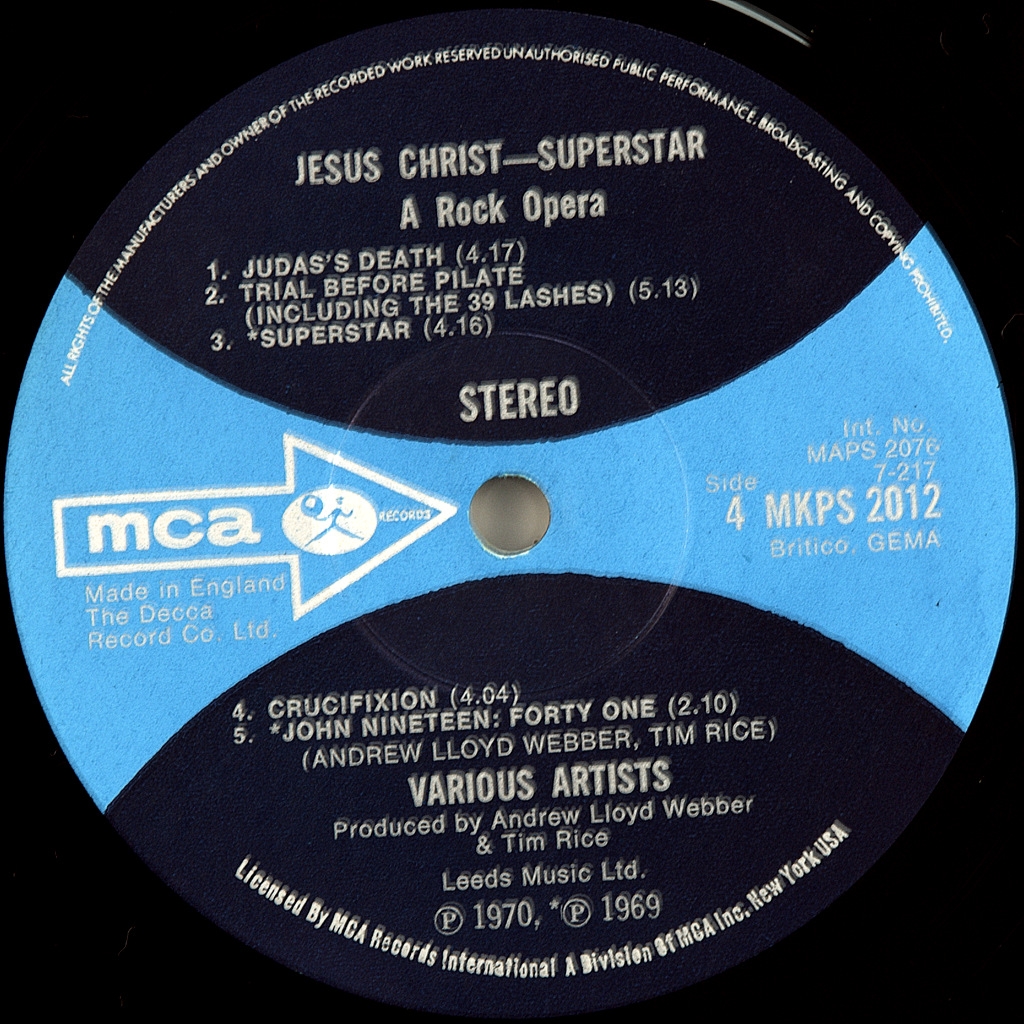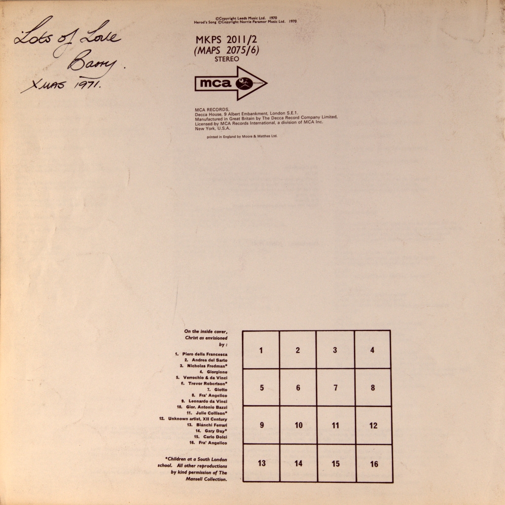 ANDREW LLOYD WEBBER/.TIM RICE-JESUS CHRIST SUPERSTAR-1970-ПЕРВЫЙ ПРЕСС (СТАНДАРТ) UK-MCA-MKPS2011/12. Очень редкое первое стандартное издание после промо, которое вышло в ноябре 1970 года. Номера матриц : 7-214-2 / 7-215 / 7-216-2/ 7-217. На буклете присутствует дарственная надпить к Рождеству 1971 участником альбома BARRY DENNON. В альбоме Jesus Christ Superstar, вышедшем в 1970 году, заглавную партию исполнил вокалист группы Deep Purple Иэн Гиллан. В записи приняли участие другие известные исполнители: Мюррей Хэд, Майк Д’Або (экс Manfred Mann), блюзмен Виктор Брокс (Каиафа), а также Пол Рэйвен (он же Гари Глиттер) и Ивонн Эллиман, ставшие известными впоследствии. Альбом Jesus Christ Superstar в 1971 году возглавил Billboard 200 и поднялся в январе 1972 года до № 6 в UK Singles Chart. Сингл из него «Superstar поднялся в чартах «Биллборда» до № 14 «I Don’t Know How to Love Him» в исполнении Хелен Редди поднялась до № 13 в Billboard Hot 100
