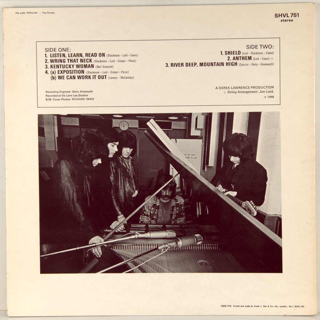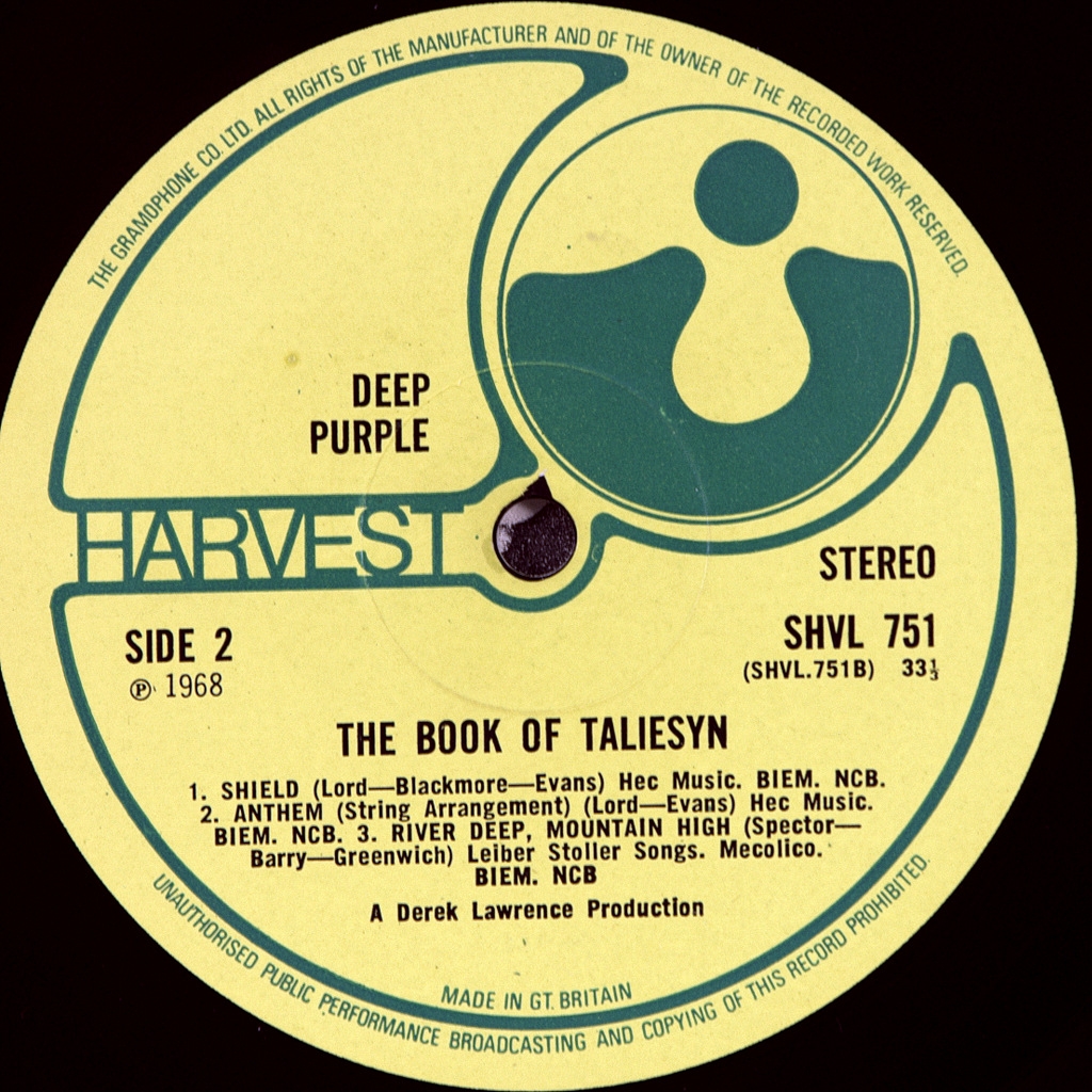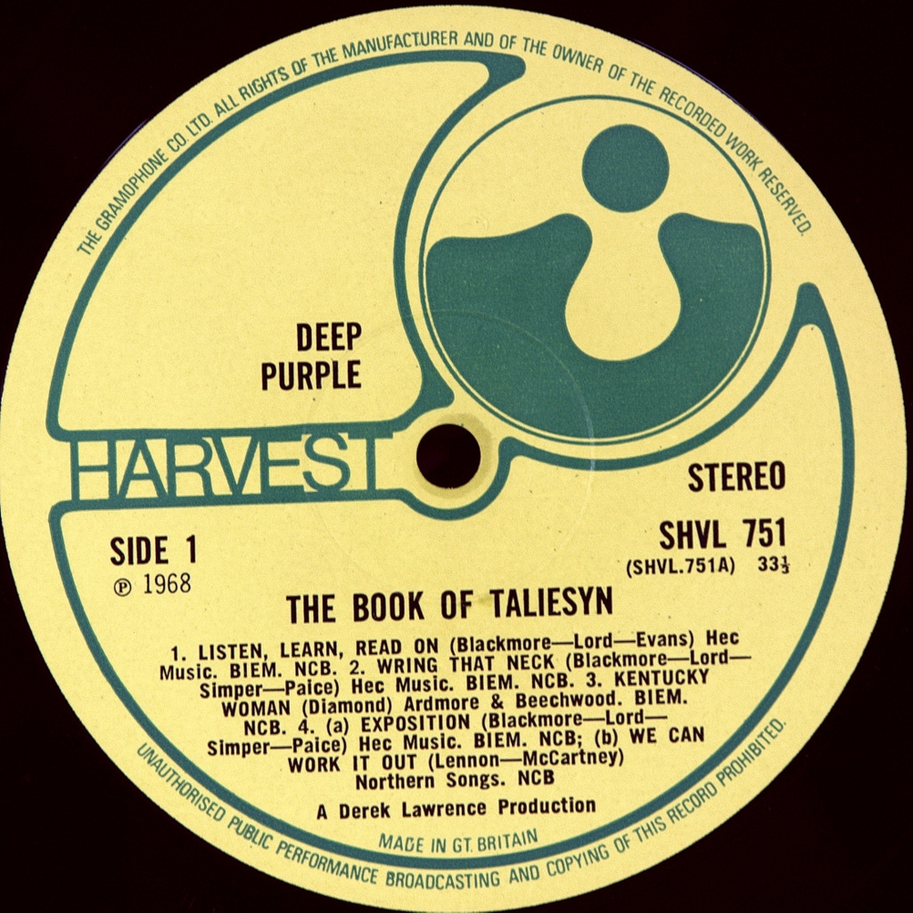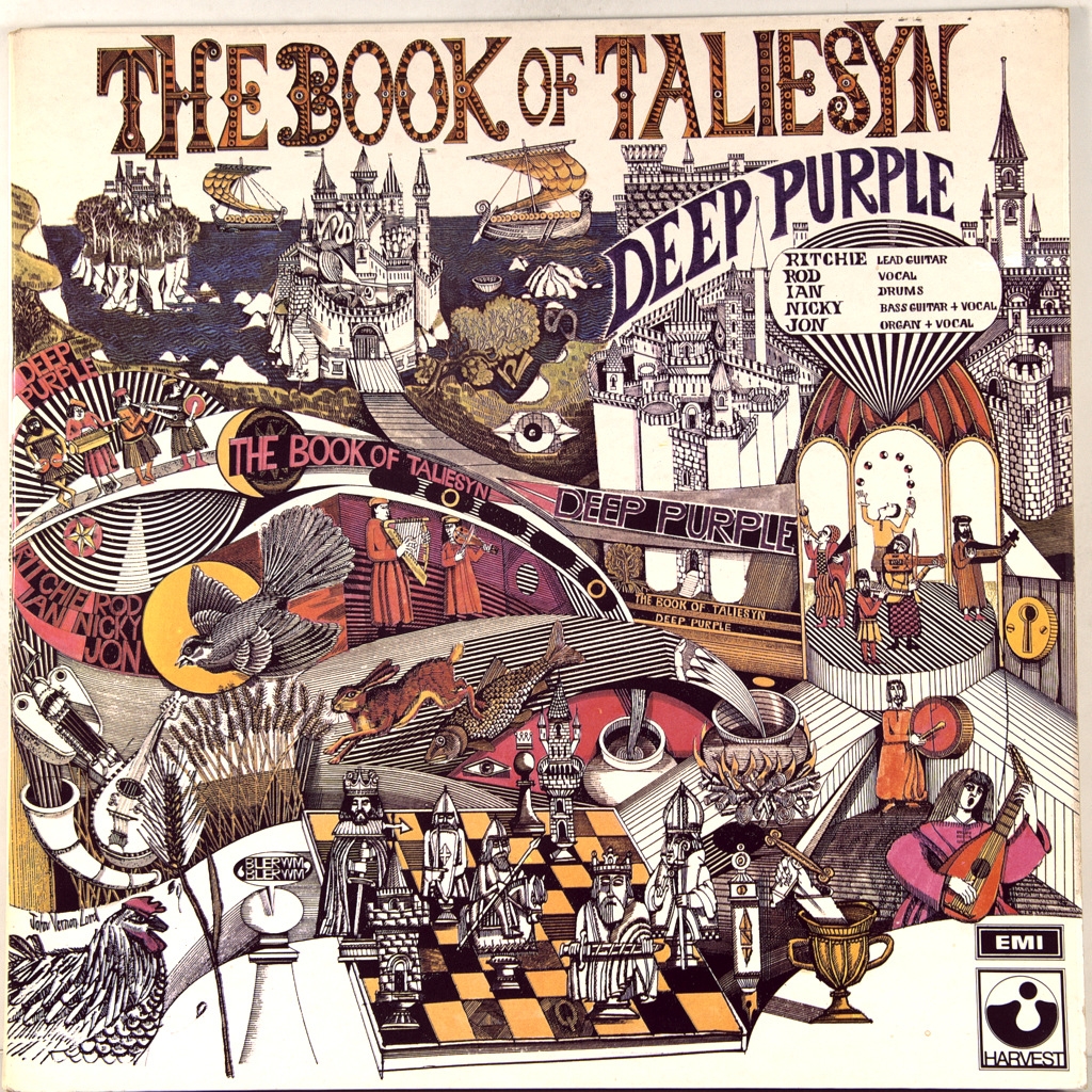 DEEP PURPLE-BOOK OF TALIESYN-1968-ОРИГИНАЛЬНЫЙ ПРЕСС 1969 UK-HARVEST-SHVL751. Матрицы A-1G/B-1G. Стампера 2GO/1GD (Очень рано!). Редкое оригинальное издание 1969 года культового альбома. The Book of Taliesyn — второй студийный альбом британской группы Deep Purple. Вышел в США в октябре 1968 года на лейбле Tetragrammaton Records, а в Великобритании — в июне 1969 года на лейбле Harvest назван в честь «Книги Талиесина» — валлийской рукописи первой половины XIV века, включающей старейшие валлийские поэмы, многие из которых приписываются поэту Талиесину (VI век). Обложку альбома нарисовал художник-иллюстратор John Vernon Lord.