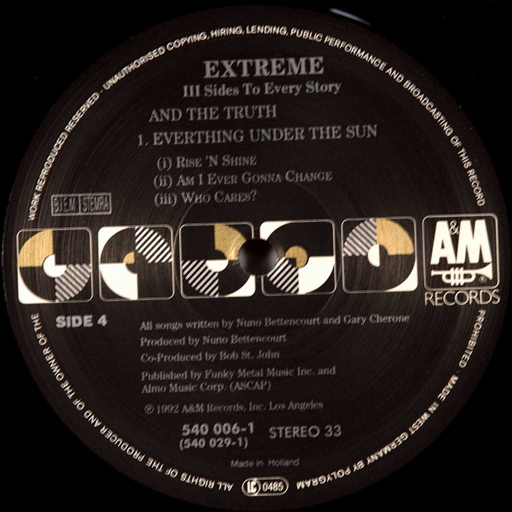 EXTREME-III SIDES TO EVERY STORY (2LP)-1992-ПЕРВЫЙ ПРЕСС HOLLAND-A?M - 540006-1. Очень редкий оригинал монстров хард-рока замешанном на глэме и фанке. III Sides to Every Story - третий студийный альбом американской рок-группы Extreme, вышедший в 1992 году. Это концептуальный альбом с условным разделением на три секции или «стороны», названными «Yours», «Mine» и «The Truth», каждая из которых имеет своё звучание и лирические образы. Несмотря на то, что фанаты и музыкальные критики считают альбом Extreme одним из лучших, III Sides to Every Story потерпел коммерческий провал (было продано всего около 700 000 копий по сравнению с дважды платиновым Pornograffitti), поскольку на нем не было хитового сингла, такого как "More Than Words" (который занял первое место в чартахBillboard Hot 100 в 1991 году), от своего предшественника Pornograffitti (хотя сингл "Rest in Peace" достиг первого места в мейнстримном рок-чарте).
