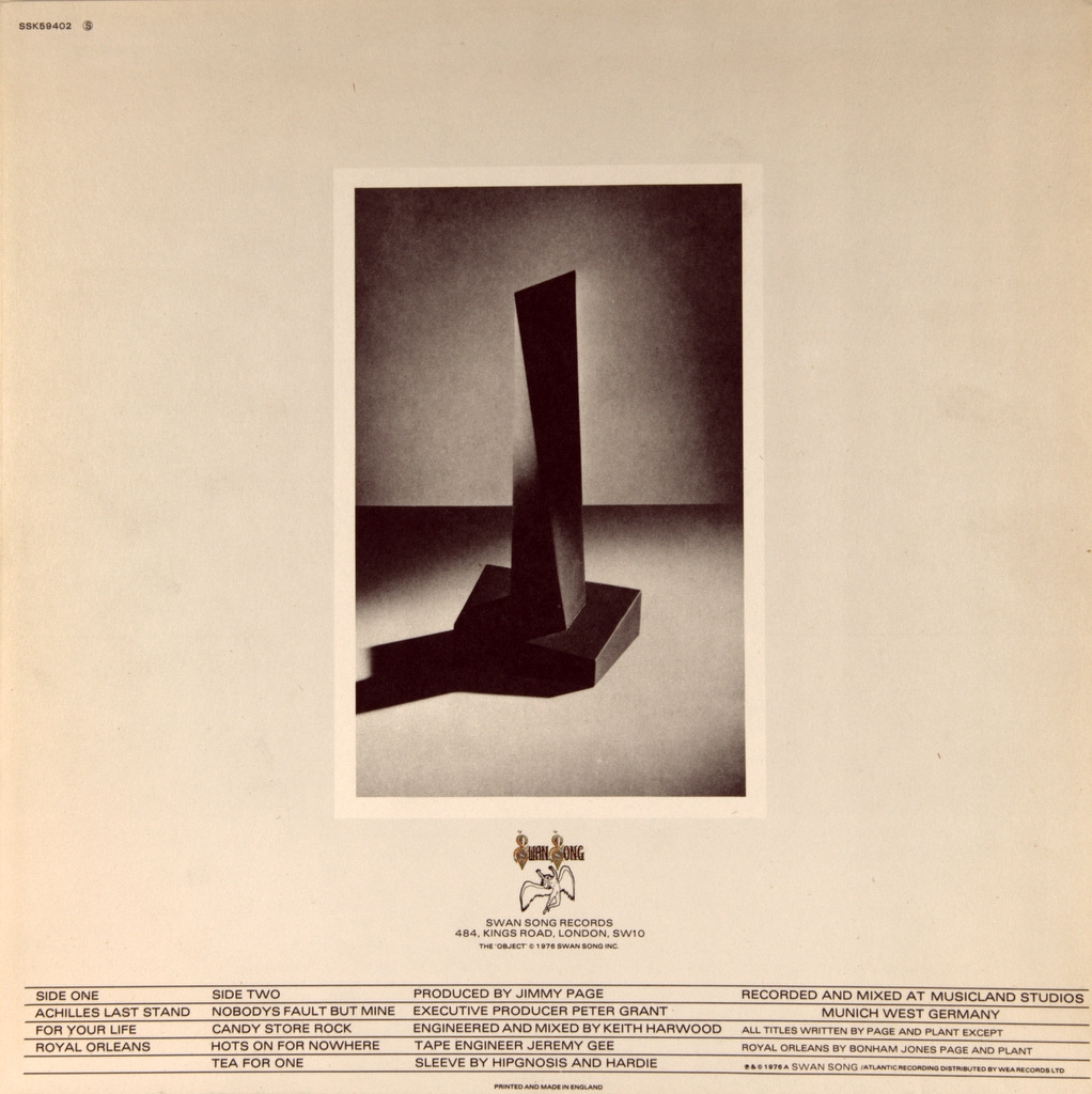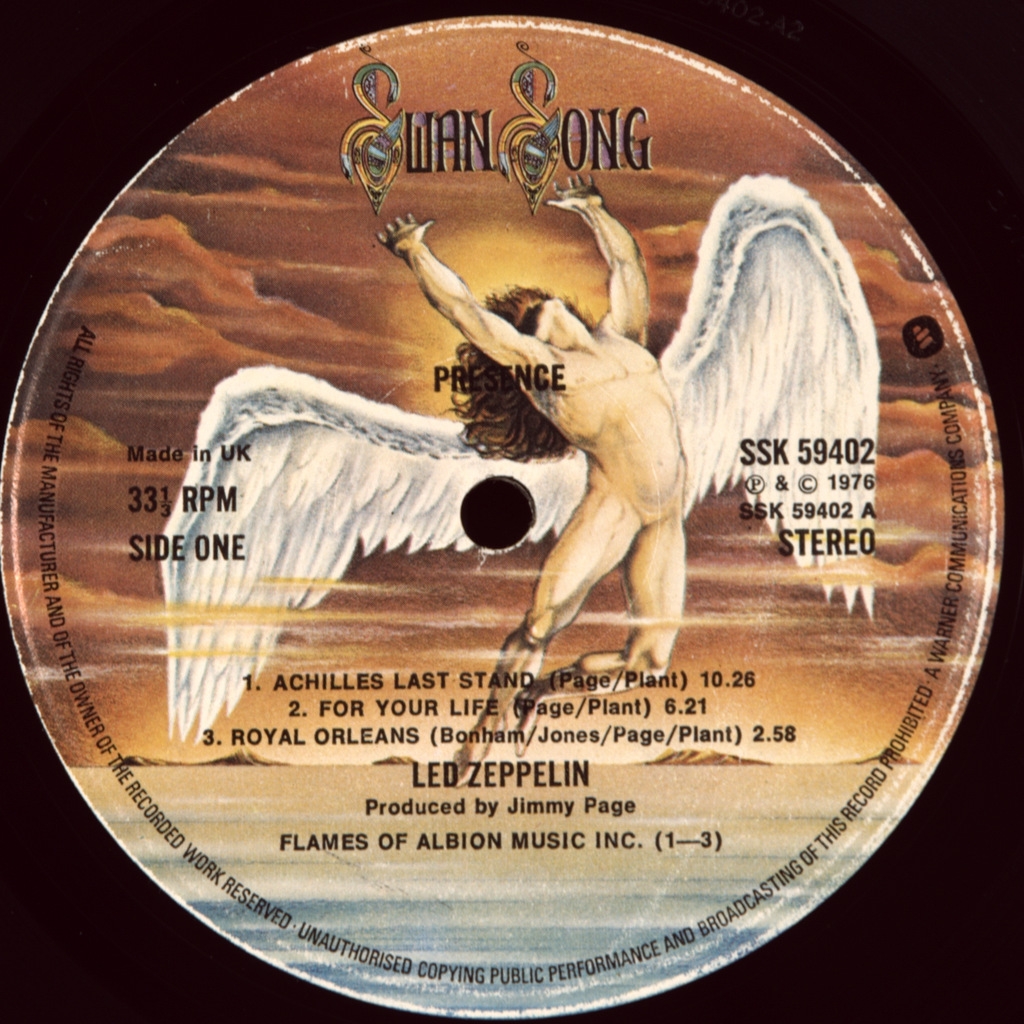 LED ZEPPELIN-PRESENCE-1976-ПЕРВЫЙ ПРЕСС UK-SWAN SONG - SSK59402. Матрицы A-2/B-2 . Редкий британский оригинал. Presence- седьмой студийный альбом британской рок-группы Led Zeppelin, выпущенный 31 марта 1976 года на лейбле Swan Song. Диск был записан в трудное время для группы, когда Роберт Плант излечивался от серьёзных травм, полученных в автокатастрофе и находился в гипсе, было неизвестно, сможет ли он ходить вообще, и будущее группы было под вопросом. Кроме того, группа находилась в цейтноте. Альбом был сделан за 18 дней и в среднем музыканты работали по 18—20 часов в сутки. Высоко оценен публикой и критиками , 1 место в UK Chart, 1 место в США Billboard 200.