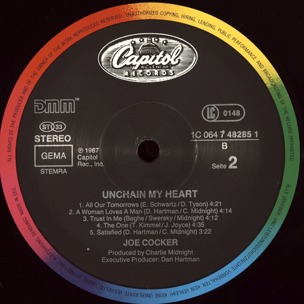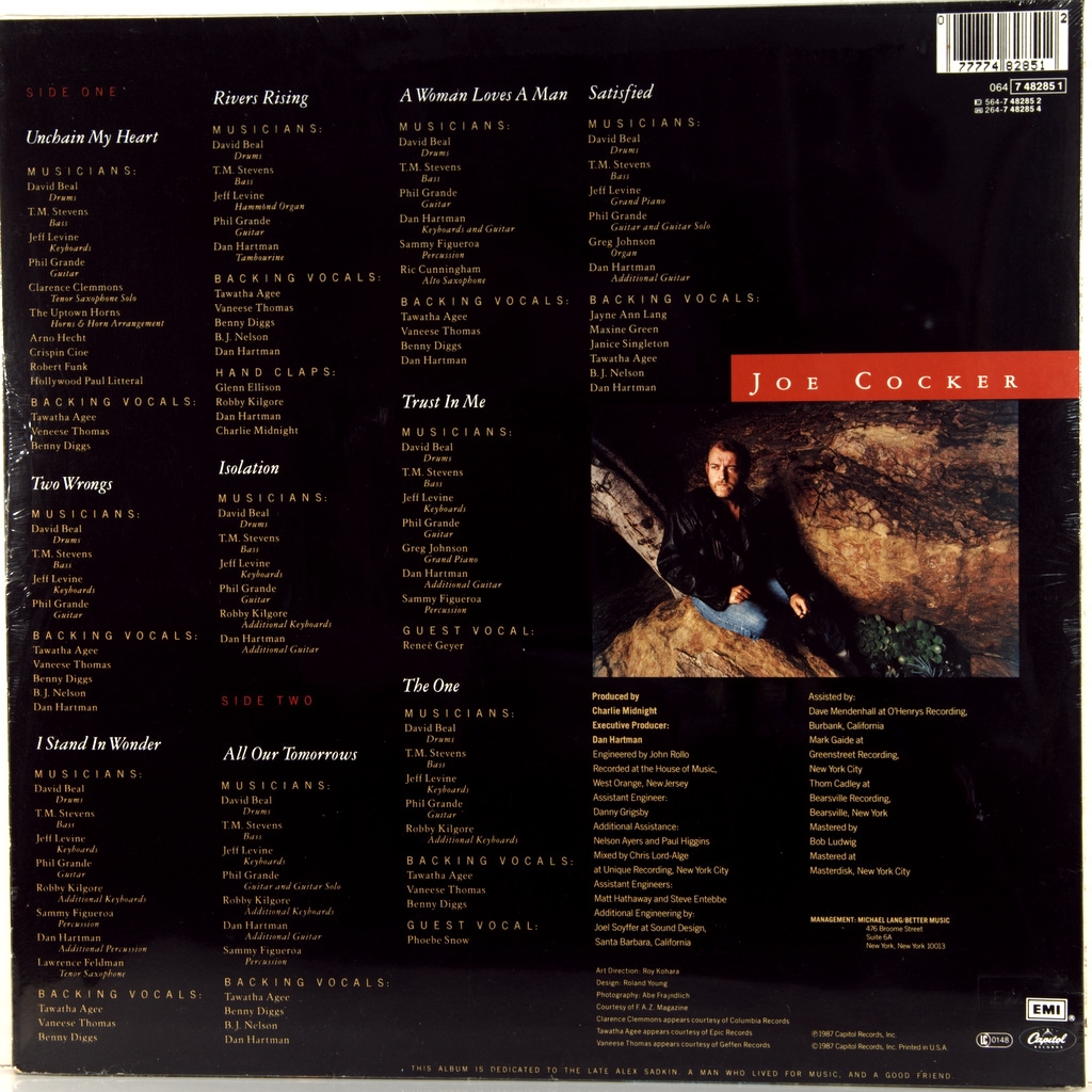 COCKER, JOE-UNCHAIN MY HEART-1987-ПЕРВЫЙ ПРЕСС UK/EU GERMANY-CAPITOL-064-748285-1. Европейский оригинал культового альбома. Unchain My Heart - одиннадцатый студийный альбом британского певца Джо Кокера, выпущенный в 1987 году. В Канаде, Германии и Франции альбом получил золотой статус продаж, в Швейцарии — платиновый. Австралийская ассоциация звукозаписывающих компаний разместила альбом на 48-ой позиции в списке «50 лучших альбомов» за 1988 год.