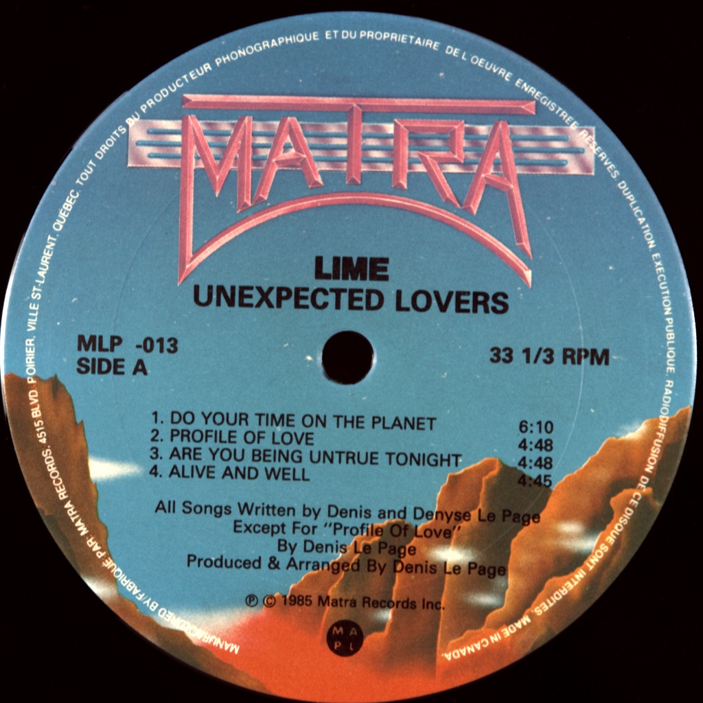 LIME-UNEXPECTED LOVERS-1985-ПЕРВЫЙ ПРЕСС CANADA-MATRA-MLP-013. Редкий оригинал канадской диско группы. Lime - канадская диско-группа из Монреаля, Квебек. Первоначально группа состояла из супружеской пары Дени и Дениз Лепаж, у которых в 1981 году был танцевальный хит номер один в США с песней "Your Love". Lime выпустили свой дебютный альбом Your Love в 1981 году. Заглавный трек стал золотой пластинкой и хитом №1 диско-чарта Billboard в США. В 1982 году вышел второй альбом Lime Lime II при поддержке сингла "Babe We're Gonna Love Tonight", который достиг №6 в танцевальном чарте Billboard.