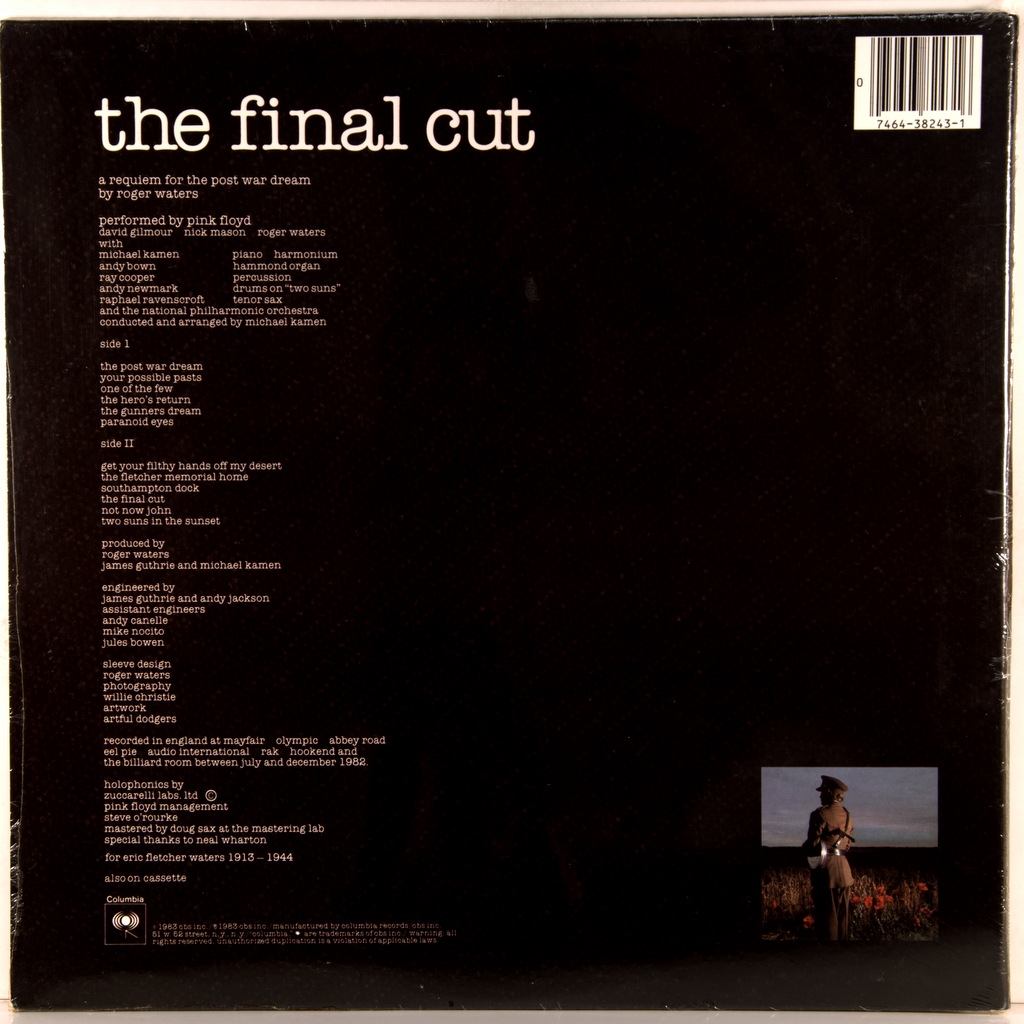 PINK FLOYD-FINAL CUT-1983-ПЕРВЫЙ ПРЕСС USA-COLUMBIA - QC38243 Матрицы A-G1A/B-G1A. Редкий американский оригинал культового альбома. Это последний альбом Pink Floyd, в записи которого участвовал Roger Waters. Альбом посвящён отцу Roger Waters погибшему во Второй мировой войне. The Final Cut был выпущен в Великобритании 21 марта 1983 года, а в США-2 апреля Он занял первое место в Великобритании, превзойдя The Dark Side of the Moon и The Wall. Он был менее успешным в Америке, достигнув шестого места в чартах альбомов Billboard. С более чем 1 000 000 единиц, отгруженных в Соединенных Штатах, Американская ассоциация звукозаписывающей индустрии сертифицировала Final Cut Platinum в мае 1983 года. В 1997 году он получил двойную платиновую сертификацию.
