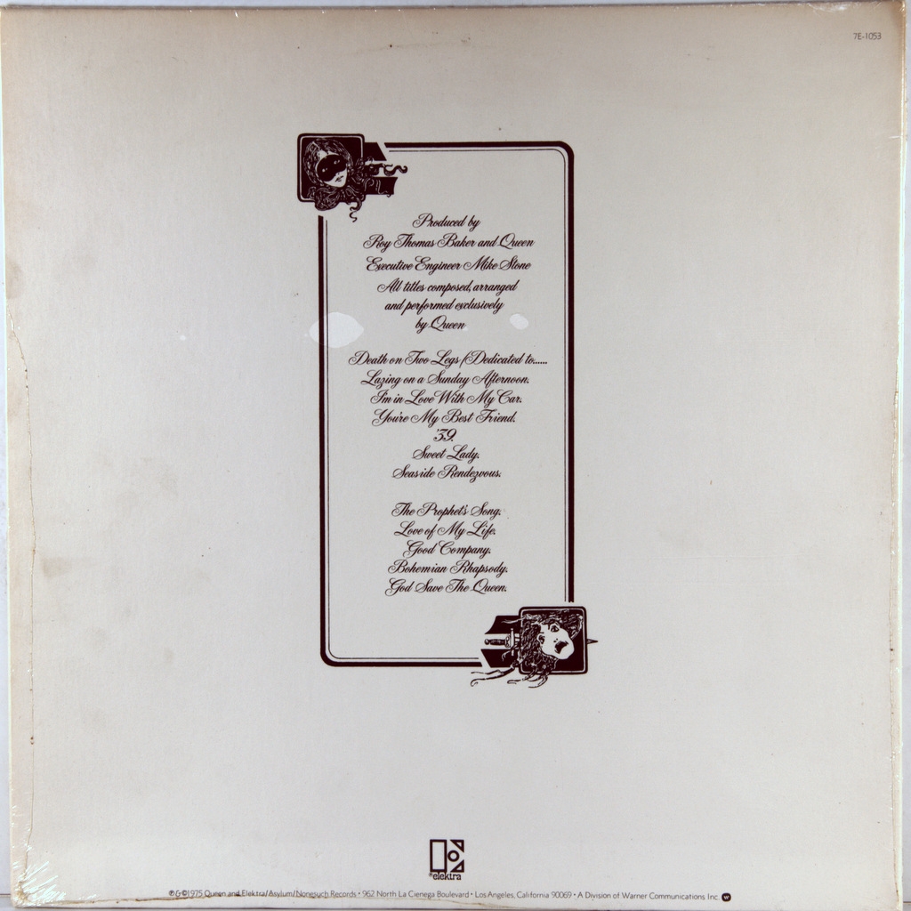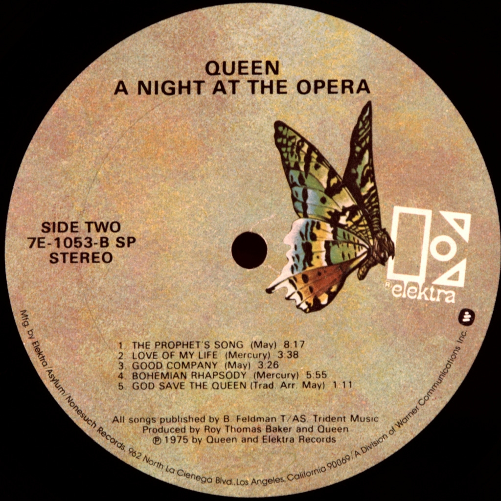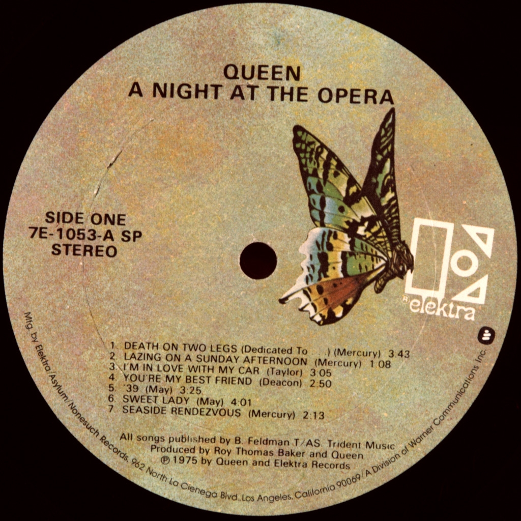 QUEEN-A NIGHT AT THE OPERA-1975-ПЕРВЫЙ ПРЕСС USA-ELEKTRA-7E-1053 SP Specialty pressing. Редкий американский оригинал. A Night at the Opera — четвёртый студийный альбом рок-группы Queen, выпущенный 2 декабря 1975 года. Пластинка имела большой успех: её продажи достигли трёх миллионов, а в чартах Британии она держалась на первой позиции четыре непоследовательных недели. Название альбома — «Ночь в опере» — так же, как и последующего, взято из репертуара американских комиков 1930-х годов братьев Маркс, а именно из одноимённого фильма. На каждом концерте Queen обязательно исполнялось несколько песен из A Night at the Opera (при этом «Love of My Life» никогда не исполнялась в альбомной версии). Принято считать, что песня «Death on Two Legs» посвящена бывшему продюсеру группы. «Bohemian Rhapsody» принесла группе оглушительный успех и в 2000 году была признана в Британии «песней тысячелетия». Завершающая альбом «God Save the Queen» — аранжированный Брайаном Мэем гимн Великобритании; именно эта композиция неизменно завершала каждый концерт группы. Альбом занял 230 место в списке 500 величайших альбомов всех времён по версии журнала Rolling Stone 2003 года, и 128 место — в списке 2020 года.