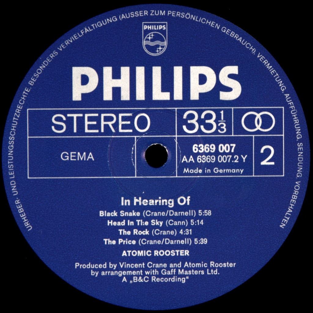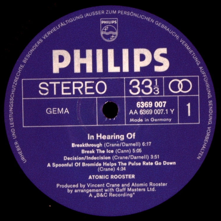 ATOMIC ROOSTER-IN HEARING OF-1971- ПЕРВЫЙ ПРЕСС GERMANY-PHILIPS-6369007. Очень редкий германский оригинал культового альбома .In Hearing of - третий студийный альбом британской рок-группы Atomic Rooster. Хотя сингл "Devil's Answer" и не был включен в альбом, незадолго до него был выпущен сингл ", достигший наивысшего успеха группы в чартах и занявший 4-ю строчку в Великобритании. Это помогло альбому подняться на 18-ю строчку британского чарта