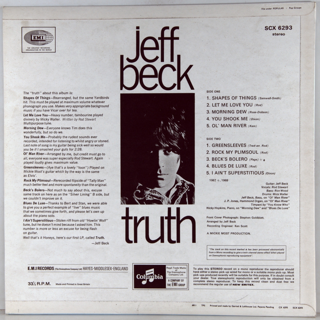 BECK, JEFF-TRUTH-1968-ПЕРВЫЙ ПРЕСС UK-COLUMBIA- SCX6293. Матрицы A-1/B-1 . Стампера 1H/1O (Мечта!) Очень редкий британский оригинал гранда блюз рока. Truth-дебютный альбом Джеффа Бека, выпущенный в 1968 году в Великобритании на Columbia Records и в США на Epic Records . Он представил таланты своей бэк-группы The Jeff Beck Group, в частности Рода Стюарта и Ронни Вуда , для более широкой аудитории и достиг номера 15 на Billboard 200 .