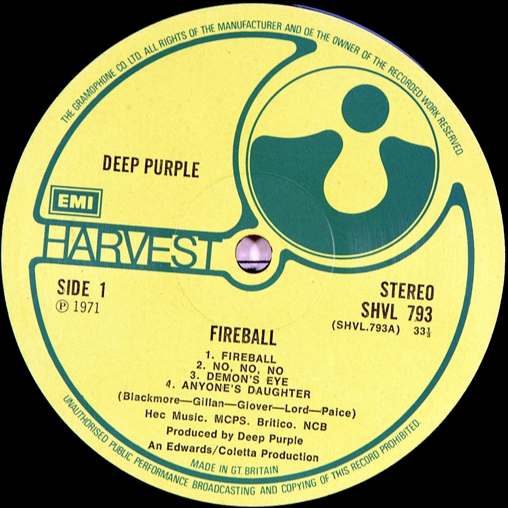 DEEP PURPLE-FIREBALL-1971-ПЕРВЫЙ ПРЕСС UK-HARVEST- SHVL793 Матрицы A-2U/B-3U . стампера 3OA/1LA (Версия лейбла "Column") Редкий оригинал культового альбома. Fireball — пятый студийный альбом британской рок-группы Deep Purple. Записан в период с сентября 1970 до июня 1971 года, выпущен в сентябре 1971 года на лейбле Harvest Records. Альбом записывался в De Lane Lea Studios (как и его предшественник). По сравнению с Deep Purple in Rock, этот альбом был записан в более экспериментальном стиле. Allmusic назвал его одним из четырёх важнейших альбомов группы, наряду с Machine Head, In Rock и Burn. Йэн Гиллан, в отличие от остальных членов группы, считает данный альбом классикой Deep Purple. Тем не менее, он заметил, что включение в альбом «Anyone’s Daughter» (в стиле кантри и с шутливой лирикой) было весёлой, но ошибкой («A good bit of fun, but a mistake»). Джон Лорд выделял несколько треков альбома, такие как «No No No» и «Fools», и особенно отметил игру Пэйса в заглавной композиции. Трек «Strange Kind of Woman», выпущенный синглом в феврале 1971 года и поднявшийся до восьмого места в британских чартах. В первую неделю было продано 20 000 копий. Альбом высоко был оценен публикой и критиками, став мультизолотым по обе стороны атлантики.