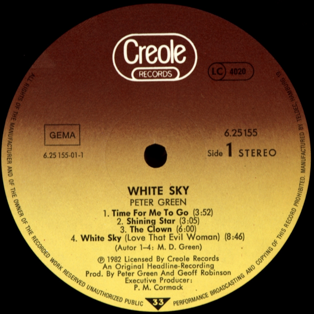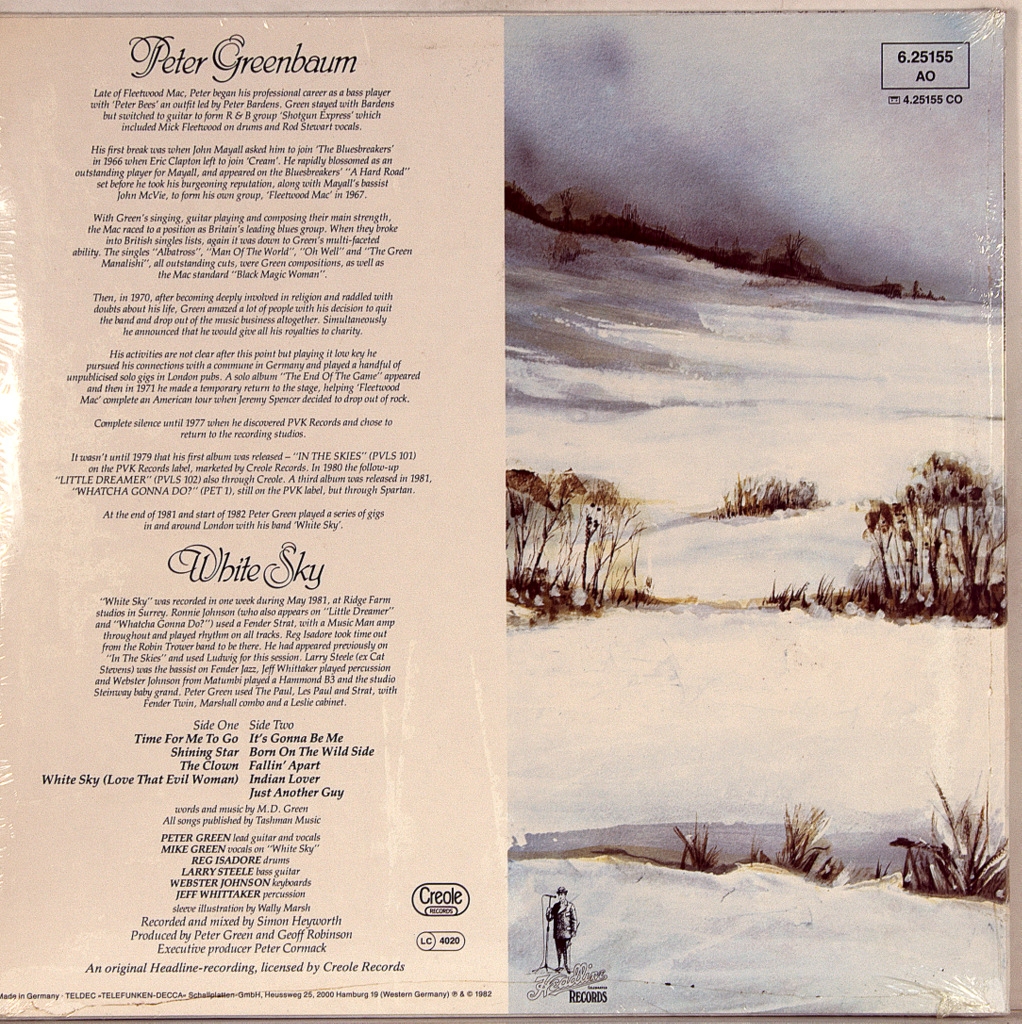 GREEN, PETER-WHITE SKY-1982-ПЕРВЫЙ ПРЕСС GERMANY-CREOLE-625155. Редкий германский оригинал мэтра блюз рока. Пятый сольный альбом британского блюз - рок музыканта Peter Green (основатель Fleetwood Mac).