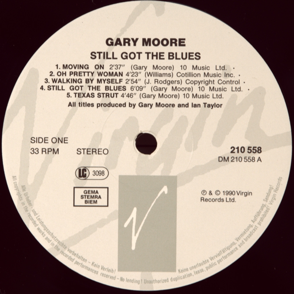 MOORE GARY-STILL GOT THE BLUES-1990-ПЕРВЫЙ ПРЕСС EU GERMANY-VIRGIN-210558. Редкий европейский оригинал легенды в рок музыке. Still Got the Blues— восьмой студийный альбом североирландского гитариста и певца Гэри Мура, изданный в 1990 году. Альбом ознаменовал собой существенное изменение стиля для Мура[1][2], который до этого альбома был преимущественно известен своими работами в стиле хард-рок с Thin Lizzy, G-Force, Грегом Лейком и во время своей обширной сольной карьеры, а также своей джаз-фьюжн-работой с Colosseum II. Как свидетельствует название, Still Got The Blues демонстрирует приверженность Мура к электрическому блюзу. Заглавный трек был выпущен как сингл и достиг № 97 в Billboard Hot 100 16 февраля 1991 года[4]. На сегодняшний день это единственный сингл Мура, который попал в данный чарт. 16 февраля 1991 года альбом занял 83-е место в Billboard 200, а в ноябре 1995 года был сертифицирован RIAA как золотой. Это был самый успешный альбом Гэри Мура как по продажам, так и по позициям в чартах в США.