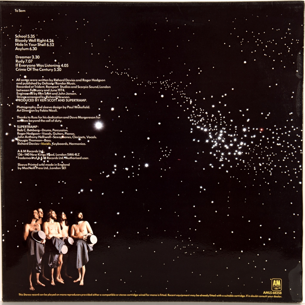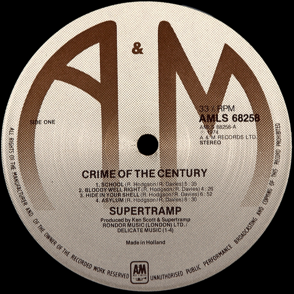 SUPERTRAMP-CRIME OF THE CENTURY-1974-ПЕРВЫЙ ПРЕСС UK-A&M-AMLS68258. Редкий британский оригинал.Crime of the Century — третий студийный альбом британской прог-рок-группы Supertramp, выпущенный в 1974 году. Это первый альбом группы в «классическом» составе и с продюсером Кеном Скоттом (англ. Ken Scott), до этого работавшим с Дэвидом Боуи и The Beatles. Crime of the Century первый альбом группы, попавший в американские Топ 40 альбомов и в 1977 году, после выпуска «Even in the Quietest Moments», получивший статус золотого.