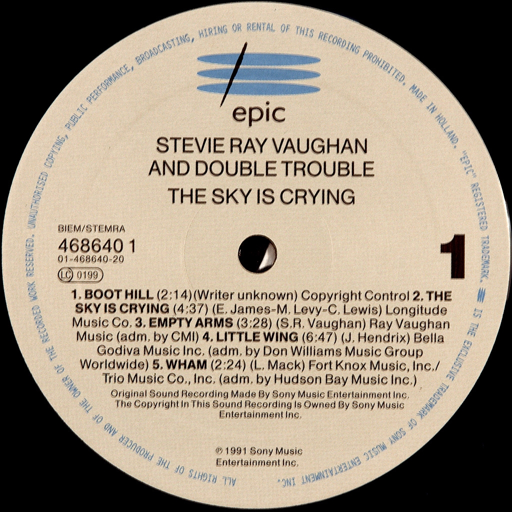 VAUGHAN, STEVE RAY AND DOUBLE TROUBLE- THE SKY IS CRYING-1991- ПЕРВЫЙ ПРЕСС UK/EU-HOLLAND-EPIC-4686401. Редкий оригинал мэтра блюз-рока. Посмертный альбом великого SRV записанный при участи его группы Double Trouble. Пластинка получила премию Грэмми в номинации ''Лучший альбом современного блюза''.