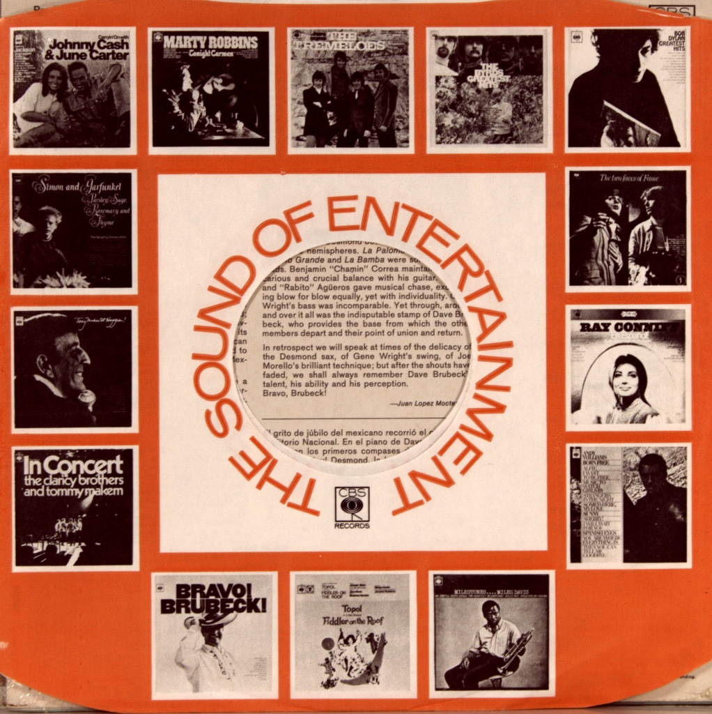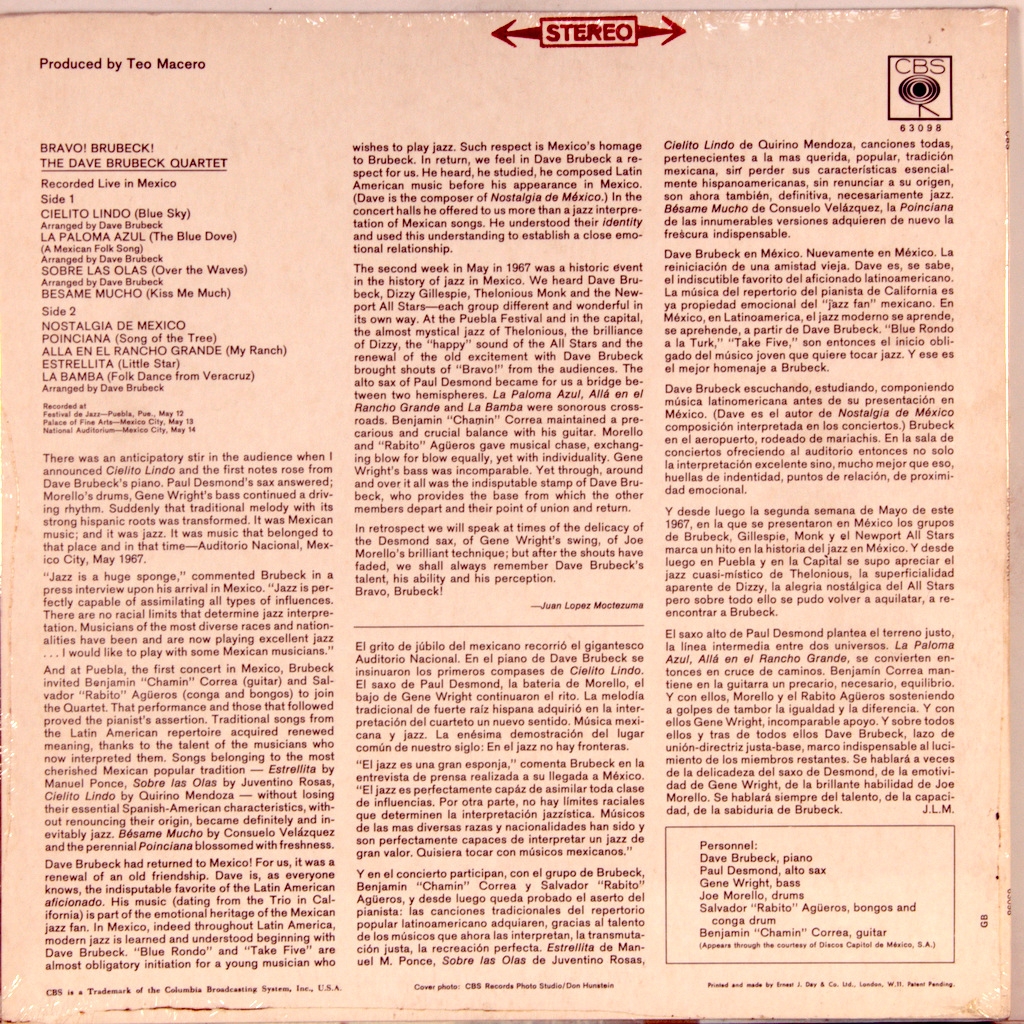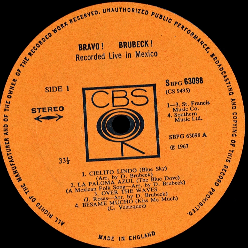 DAVE BRUBECK -BRAVO BRUBECK-1967-ПЕРВЫЙ ПРЕСС UK-CBS- SBPG63098. Редкий британский оригинал культового альбома.Браво! Брубек! - концертный альбом Дэйва Брубека и его квартета 1967 года, записанный во время их тура по Мексике. Квартет пополнили Чамин Корреа на гитаре и игрок на бонго и конге Сальваторе Агуэрос. Он был выпущен в 1967 году. Альбом достиг 9-й строчки в чарте Billboard лучших джазовых альбомов.