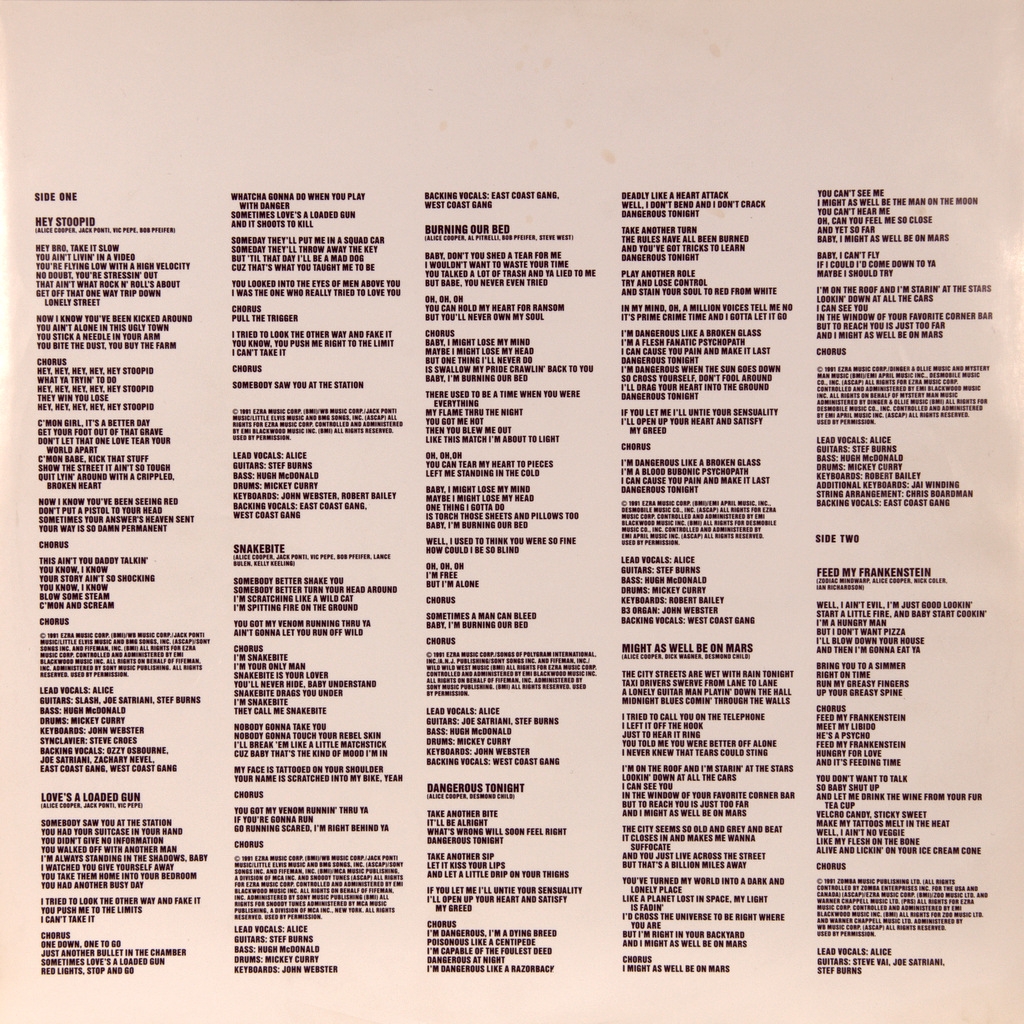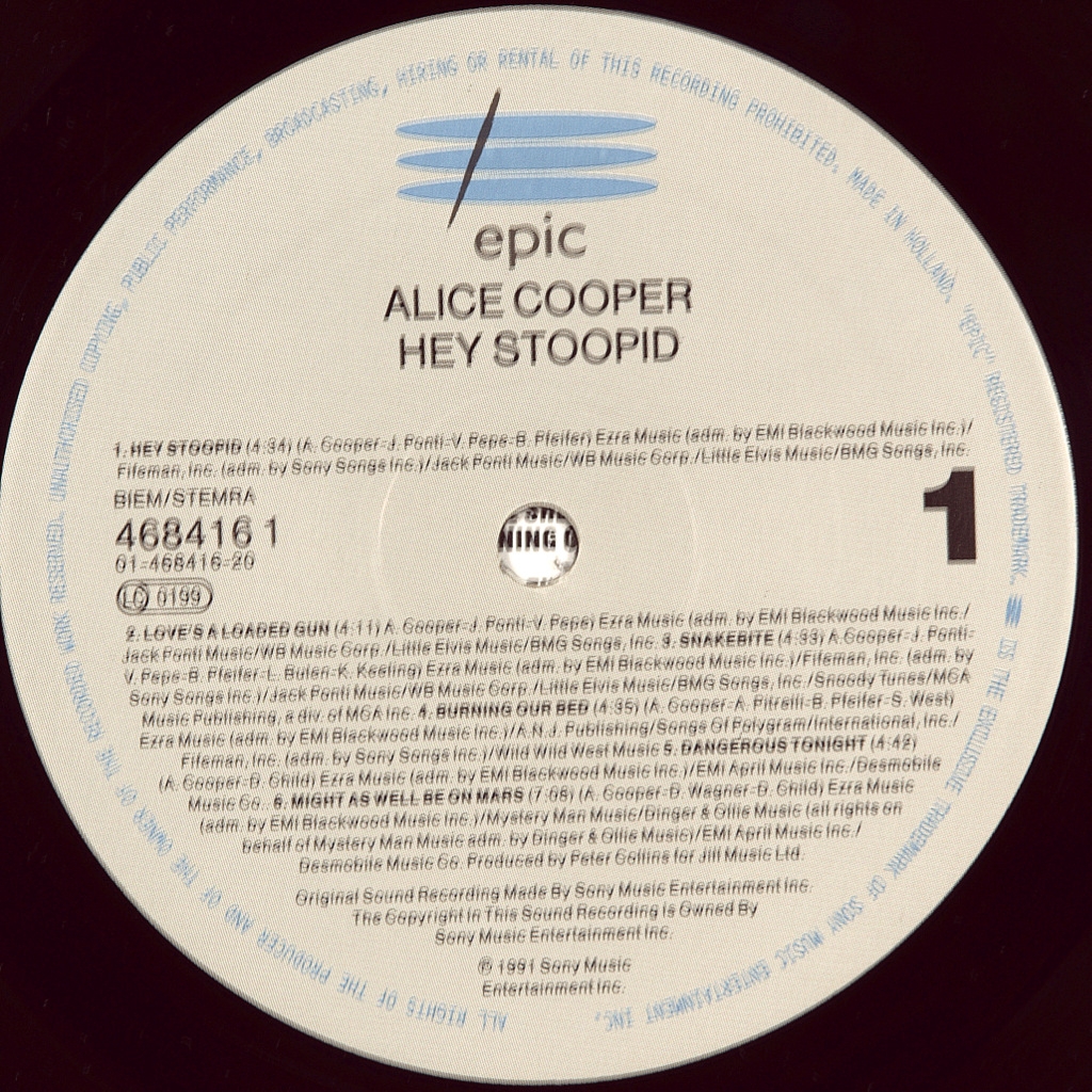 ALICE COOPER-HEY STOOPID-1991-ПЕРВЫЙ ПРЕСС HOLLAND-EPIC- 4684161 Редкий европейский оригинал культового альбома. Hey stoopid- двенадцатый сольный студийный альбом американского рок-певца Элиса Купера, выпущенный 2 июля 1991 года на Epic Records. После своего громкого хитового альбома 1989 года "Trash" Купер попытался продолжить свой успех следующим альбомом, на котором выступили Лэнс Булен, Слэш, Оззи Осборн, Винни Мур, Джо Сатриани, Стив Вай, Никки Сикс и Мик Марс (оба из Motley Crüe). Hey Stoopid был последним альбомом Купера с участием басиста Хью Макдональда до того, как он присоединился к Bon Jovi в 1994 году. По словам ассистента Купера Брайана Ренфилда, первоначально рассматривалась альтернативная обложка, которую Ренфилд описал как "хардкорную с иглами для шприцев, таблетками ..." Примечательно, что в треке "Feed My Frankenstein" знаменитый гитарный дуэт Стива Вая и Джо Сатриани играет вместе в сопровождении Никки Сиккс на басу. Альбом занял высокие места в чартах многих стран. Австралийские альбомы (ARIA)-15 место, Австрийские альбомы (Ö3 Австрия)-5 место, Голландские альбомы (Топ-100 альбомов)-54 место, Немецкие альбомы (Топ-100 Offizielle-7 место,